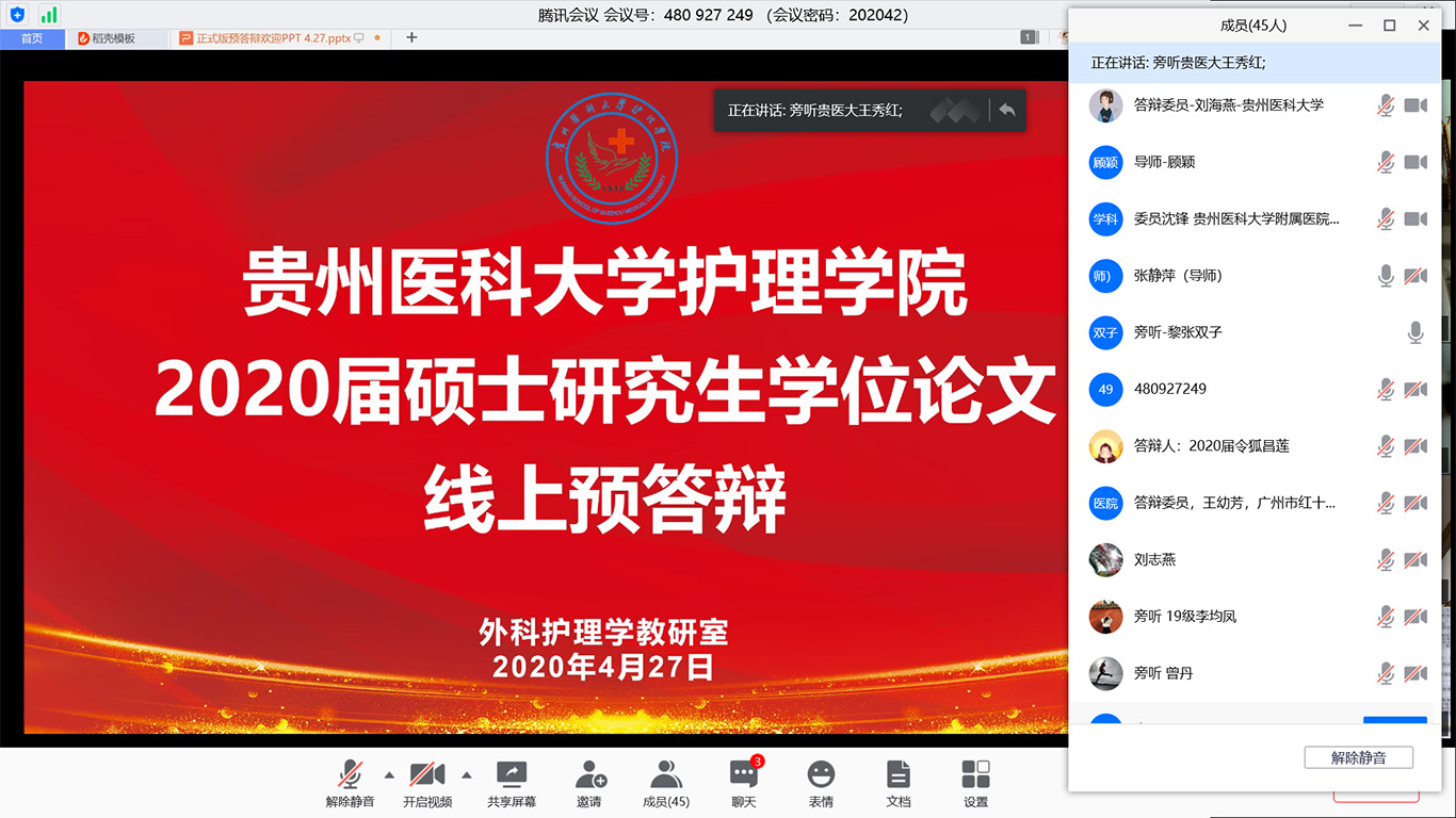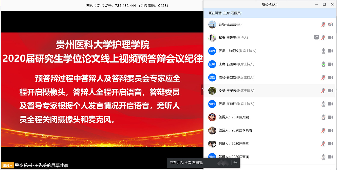此次线上预答辩采用腾讯会议平台,8名毕业班研究生同学按研究方向分成两组进行。答辩委员会主席和委员分别由贵州中医药大学1683168诸侯快讯官网党委书记石国凤教授、遵义医科大学1683168诸侯快讯官网院长江智霞教授、贵州省人民医院柏晓玲博士、1683168诸侯快讯官网附属医院ICU主任沈锋博士、骨科博士后叶川教授、老年医学科教授莫显刚博士、广州红十字会医院王幼芳副主任护师、1683168诸侯快讯官网公共卫生学院王子云博士、刘海燕副教授、1683168诸侯快讯官网基础医学院许健炜博士担任。两场预答辩共有近100人参加,学校研究生教育督导专家、1683168诸侯快讯官网及附院导师、专业教师和全体研究生同学参加预答辩旁听。