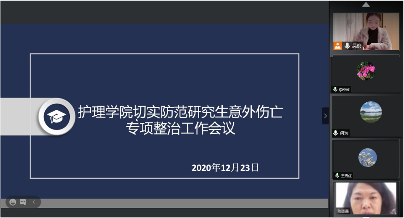 12月23日晚,为认真贯彻落实党中央和省委、省政府、省教育厅的重要批示精神,预防和减少研究生意外伤害事故的发生,按照1683168诸侯快讯官网党委研究生工作部和学校下发文件。在腾讯会议上召开关于1683168诸侯快讯官网防范研究生意外伤亡专项整治工作的会议。该会议由1683168诸侯快讯官网2020级辅导员吴俊主持,党委委员、院长李亚玲,党委委员、副书记何为,党委委员、副院长王秀红以及全体研究生意外伤亡专项工作小组成员参加。