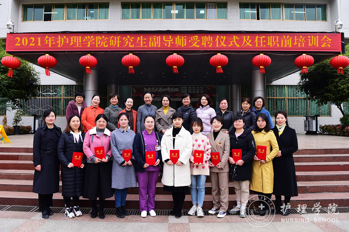 受聘仪式开始前王秀红介绍诸侯快讯研究生副导师遴选工作的开展过程和情况。随后,刘志燕宣读副导师名单,杨英、李亚玲为副导师颁发聘书。赵雪作为副导师代表讲话并表态,一定会珍惜宝贵的锻炼机会,加强自身学习和建设,认真配合好导师工作,为培养出高质量的硕士研究生而努力。附属医院护理部副主任蔡鹏代表导师发言,她对副导师的加入表示热烈的欢迎和深切的期待,希望副导师充分发挥科研特长和专业特长,大胆工作,与导师一起携手把研究生培养好。李亚玲讲到副导师作为新生力量的注入,要充分积极发挥自身在科研、教学、专业等方面的优势,不断学习,互帮互补,快速成长,为促进护理学科高质量发展起到承上启下的重要职责和作用。杨英讲到副导师的遴选和加入,开启了我校护理学科发展的新起点,她勉励在座的教师要不断增强使命感、责任感,以身作则,落实立德树人的根本任务,勤奋创新、虚心学习,促进护理学科高质量发展。受聘仪式后全体参会人员在行政楼前合影。