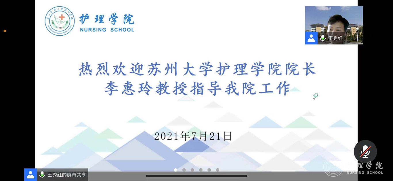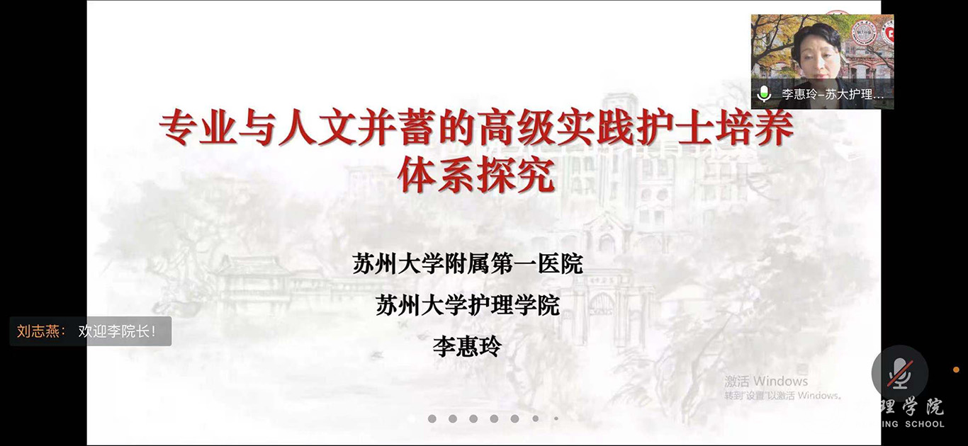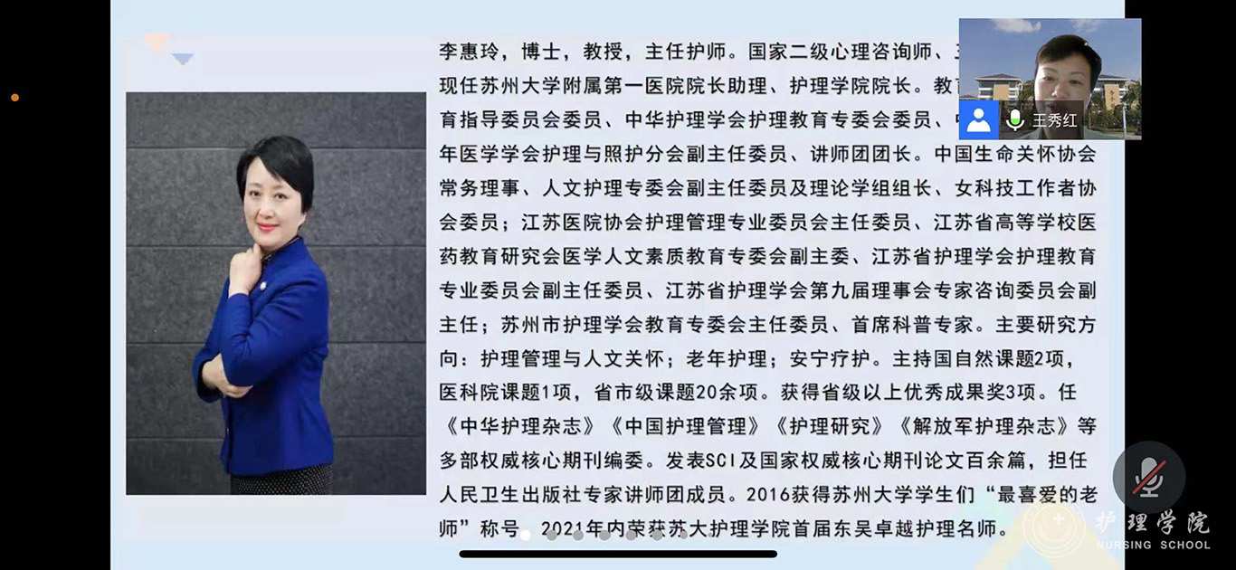 为进一步推进我校护理学科内涵建设,提升我校护理专硕研究生培养质量,7月21日,1683168诸侯快讯官网特邀苏州大学附属第一医院院长助理、1683168诸侯快讯官网院长李惠玲教授为师生开展了题为《专业与人文并蓄的高级实践护士培养体系探究》的专题讲座,并进行指导。讲座和指导通过腾讯会议进行,1683168诸侯快讯官网党委委员、副院长刘志燕、附属医院护理部副主任蔡鹏、顾颖及研究生导师、副导师、学院和附院相关教师及研究生共计110余人参加,1683168诸侯快讯官网党委委员、副院长王秀红主持活动。