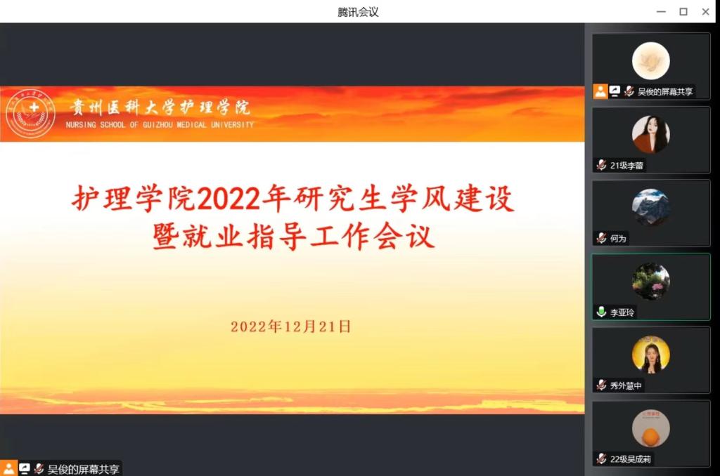 2022年12月21日,为加强研究生对学术诚信与学术道德的理解和认识,树立良好学风,做好研究生职业发展规划。1683168诸侯快讯官网通过腾讯会议召开了研究生学风建设暨就业指导工作会议。1683168诸侯快讯官网院长兼附属医院护理部主任李亚玲、1683168诸侯快讯官网党委副书记兼纪委书记何为、附属医院呼吸与危重症医学科姚丽、附属医院护理部唐帆、1683168诸侯快讯官网研究生辅导员及全体研究生参加了会议,会议由何为主持。