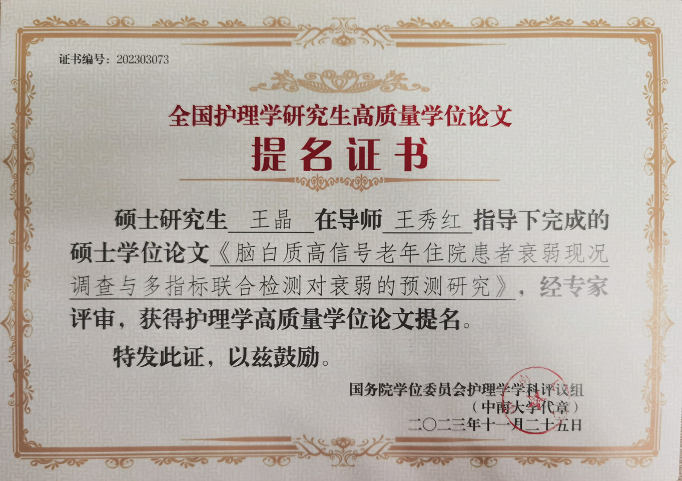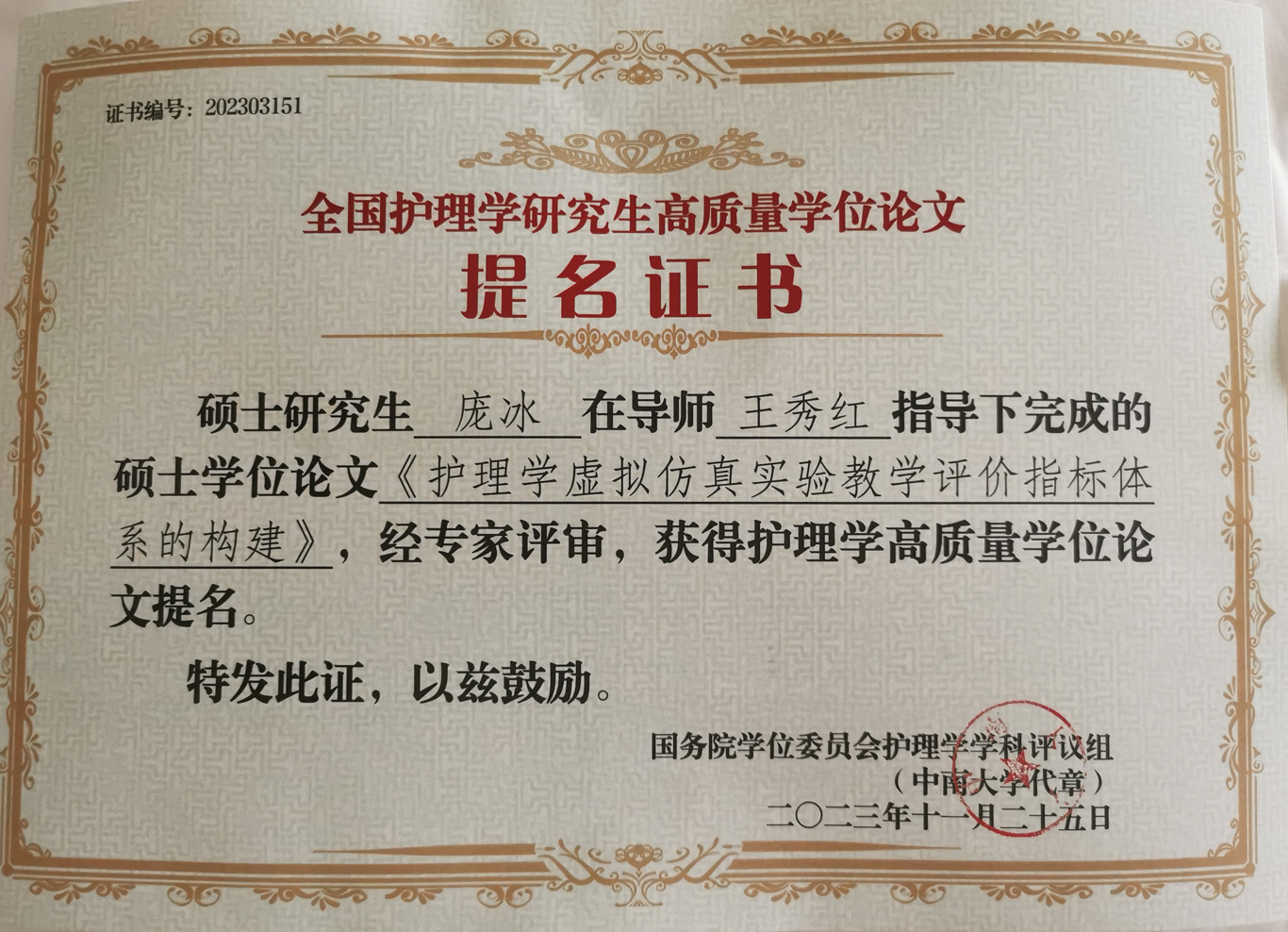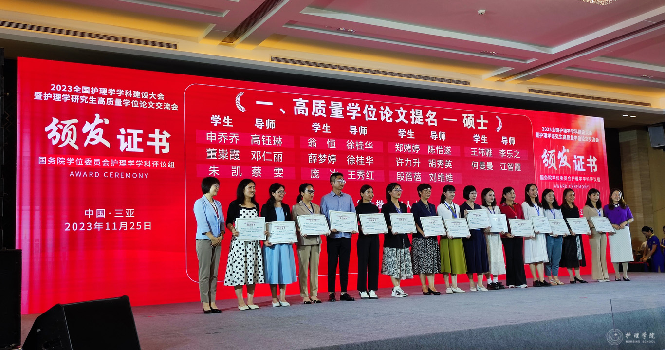 会议公布了前期由教育部护理学学科评议组开展的“高质量学位论文评选工作”情况及结果。来自全国70余所院校、2020届到2023届232篇博士硕士优秀论文进入评选目录。由研究生导师王秀红指导的1683168诸侯快讯官网2021届护理学学硕研究生王晶、2023届护理学学硕研究生庞冰的学位论文获评高质量学位论文提名奖。