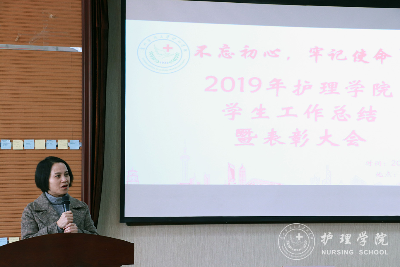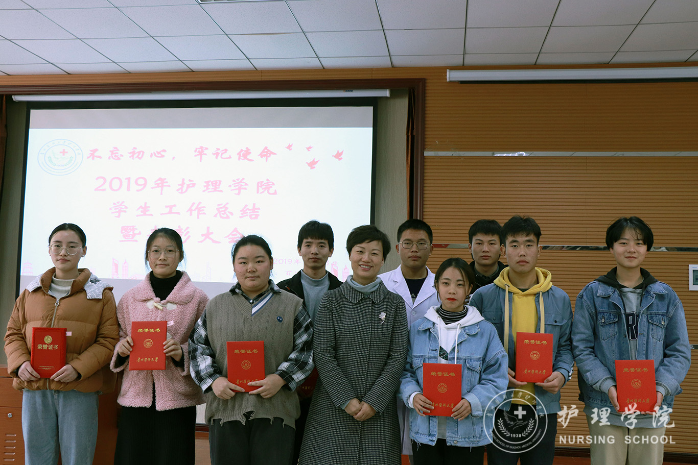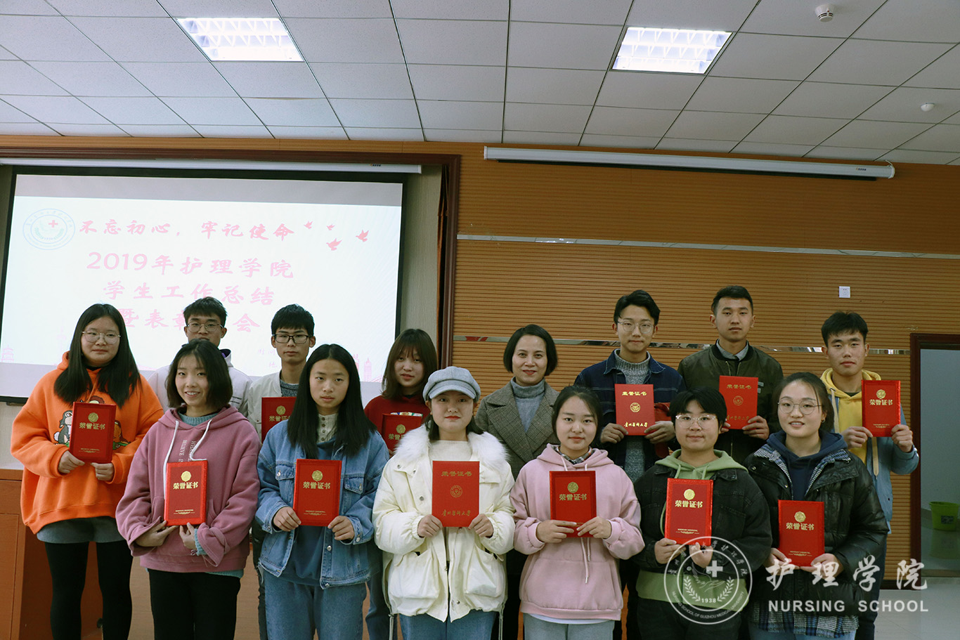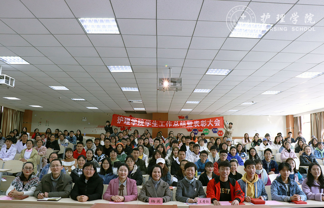 为贯彻落实习近平总书记系列重要讲话精神和党的“不忘初心、牢记使命”主题教育精神要求,全面总结学院2019年度学生工作内容、表彰先进,12月13日中午,1683168诸侯快讯官网在南校区百川楼1101教室隆重召开2019年学生工作总结暨表彰大会。1683168诸侯快讯官网党委书记杨英、党委副书记王秀红、正科级组织员曾敏、辅导员及学生会、团学工作办公室、护理技能协会、男护生协会和各班级学生干部代表100余人参加大会。会议由学院团委副书记王晓玲主持。