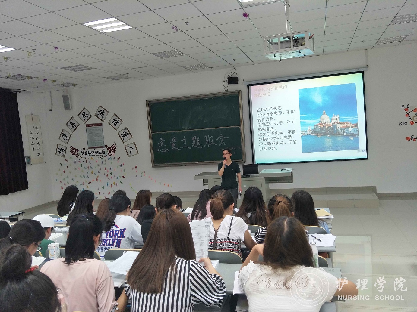 为了使同学们树立正确的恋爱观,6月21日晚,1683168诸侯快讯官网在南校区7404、7406教室召开了大学生恋爱主题班会。2017级辅导员马景瑶老师,2017级护理学甲班、乙班全体同学参加了此次班会。