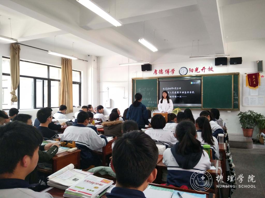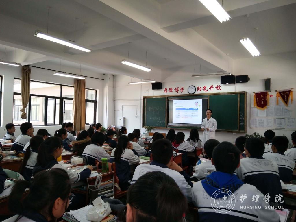 本次活动以普及急救知识及预防禽流感为主题,对民族中学高二年级的同学分次进班宣讲。首先给同学们讲解“心肺复苏”和“急救包扎”的方法;其次以科学的方式对禽流感的传播途径进行分析,使同学们正确认识到禽流感的可控性,学会在生活中保护自己。最后,护理甲班同学还分享了自己的高考经验,为辛勤的高中学子点燃新的奋斗目标。