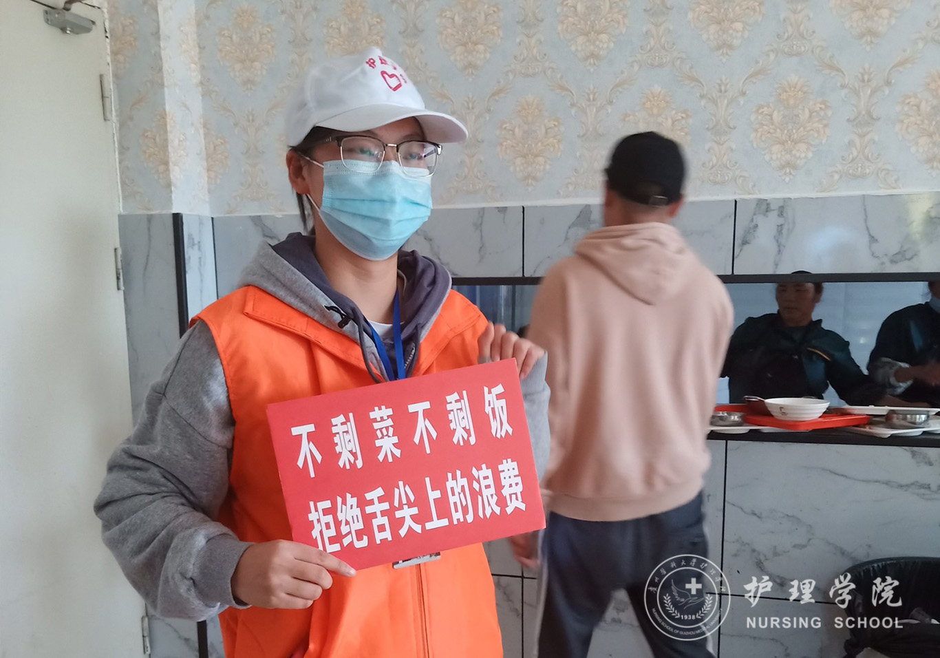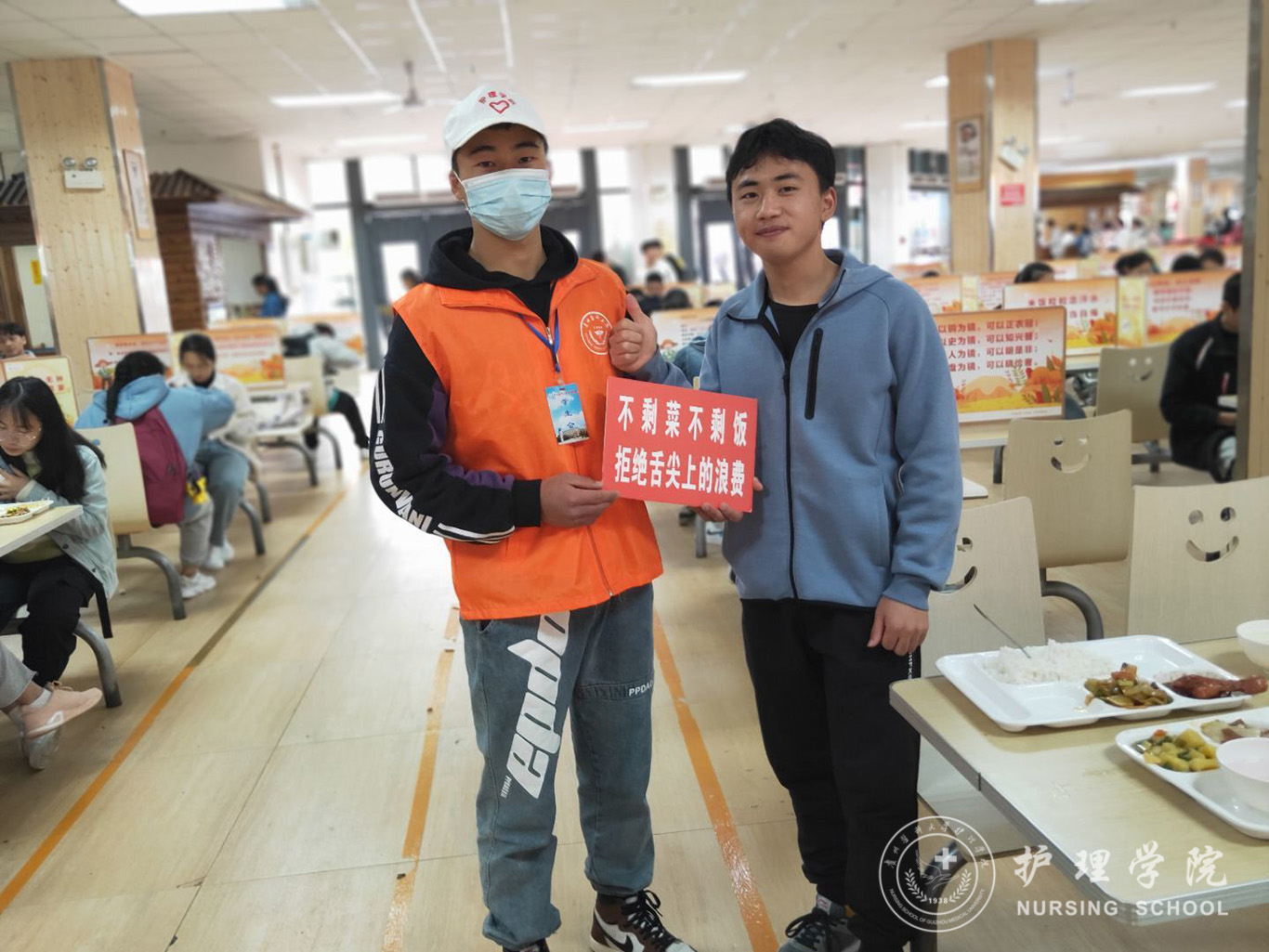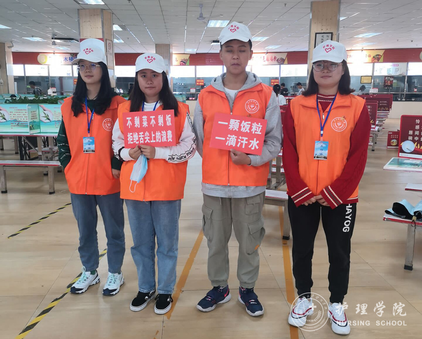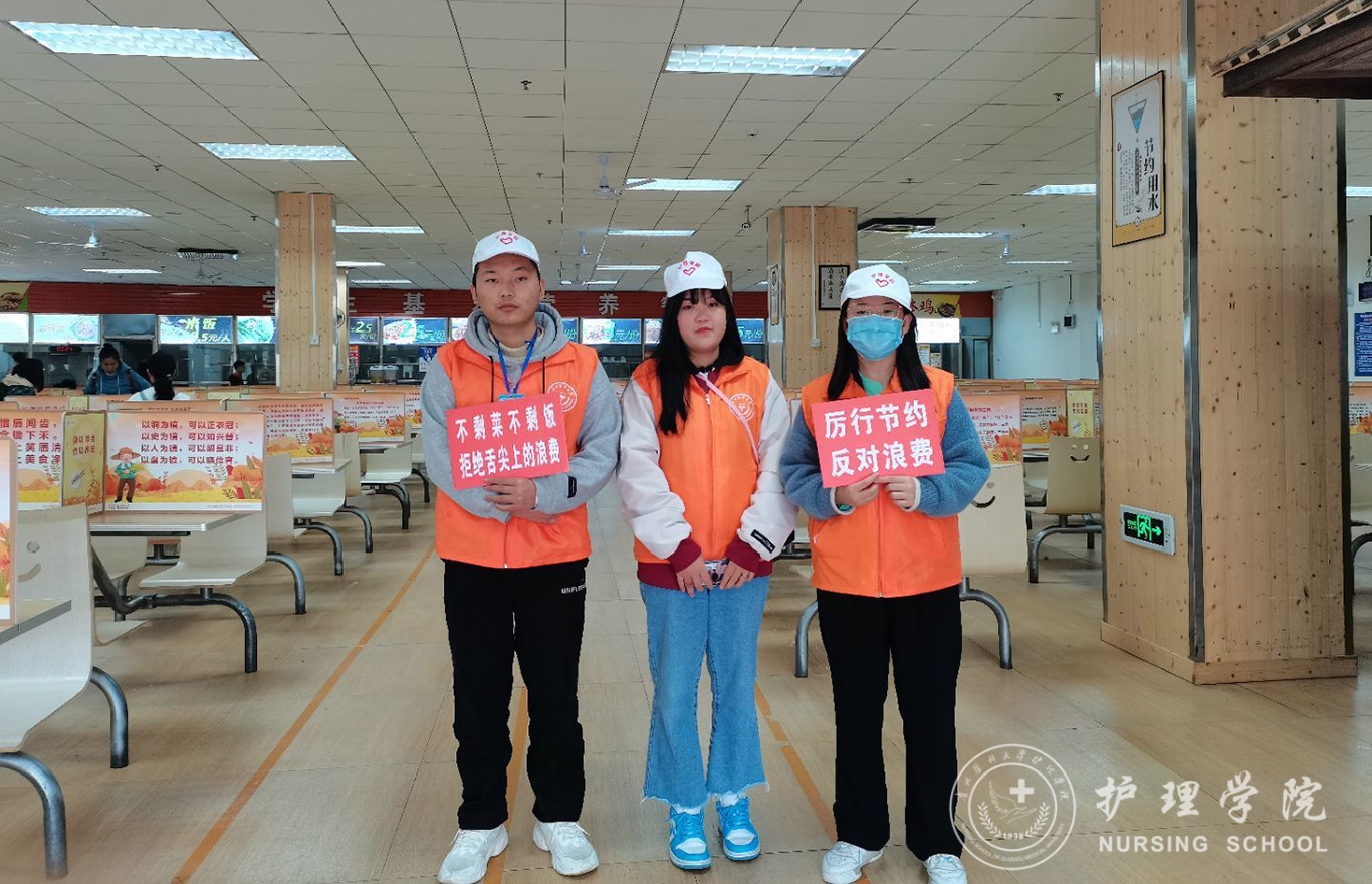 志愿者们身穿鲜明的服装,手持印有“厉行节约、反对浪费”的宣传标语,站在食堂门口仔细观察已用完餐的老师、同学们的餐盘,观察浪费情况的严重与否,对手持空盘的同学表示赞许,通过随机的方式,任意选取正在就餐的同学询问一些问题,了解同学们的饮食习惯及对节约粮食的看法或做法,帮助同学们在生活中树立节约的良好习惯。