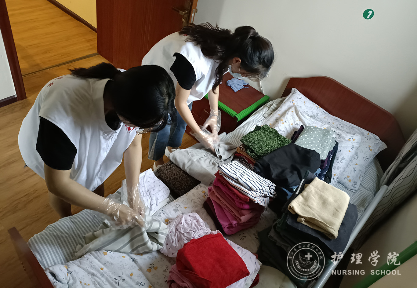进入敬老院,给我带来了意外惊喜。原本我以为老人们应该都是坐在轮椅上,甚至是生活不能自理的老人,但是一开始映入眼帘的是一位充满活力的老爷爷。他热情的与我们打招呼,笑容和蔼、身形矫健,跟着视频做操、打太极。随后,我被安排到三楼为老年人整理衣物和被子。根据气候的变化,我把厚实的衣物放在最里面,把薄的衣物放在最外面,方便老年人拿取换洗。在整理的过程中,我发现老年人的衣物大多以睡衣为主,外出的衣物极少,主要都是舒适干净的衣物,这也提示我们为家中老人购置衣物时要以舒适方便为主。