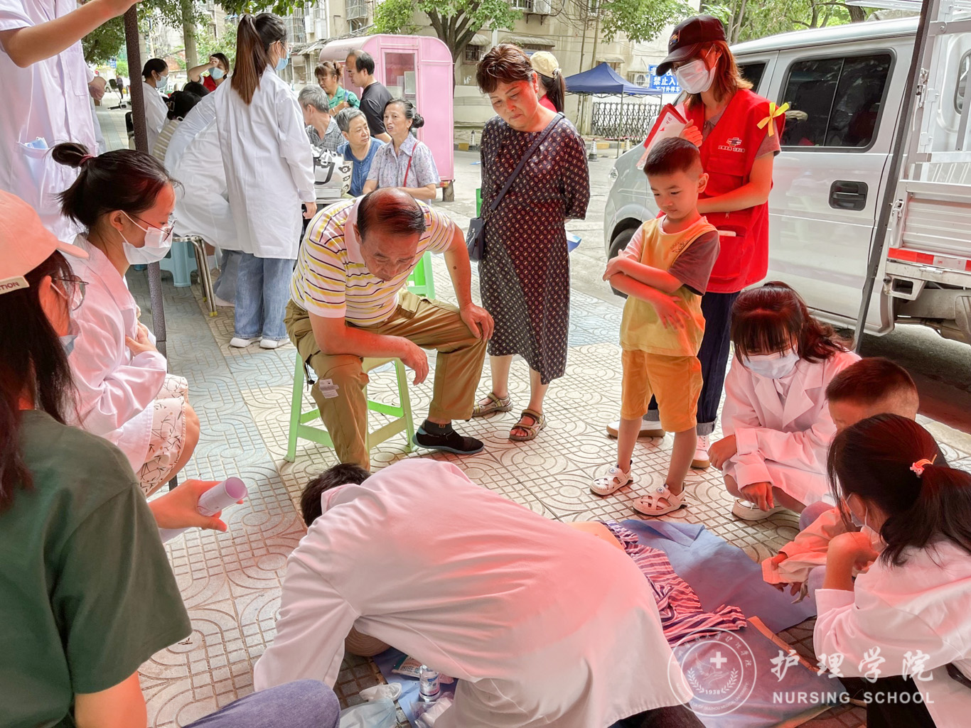 清晨,在E班团支书的带领下,志愿者有序进入贵医社区开展志愿服务。经过前期的精心策划和安排,现场活动井然有序的开展。活动开始,志愿者为前来咨询的居民们测量血压、提供身体健康咨询、普及医保等惠民政策。活动中期,随着居民越来越多,志愿者现场给社区居民们普及了心肺复苏术(CPR)、海姆立克急救法、常规止血包扎术、防中暑、溺水等科学急救知识并进行实操演练,演示结束后,志愿者邀请居民们进行急救实操体验并给予指导,现场学习热情积极性高涨。最后,志愿者为参与活动的居民们赠送了水果、鸡蛋、自制手摇扇、购物布袋等小礼品,赠品虽小,却承载了志愿者们的爱心和祝福。
