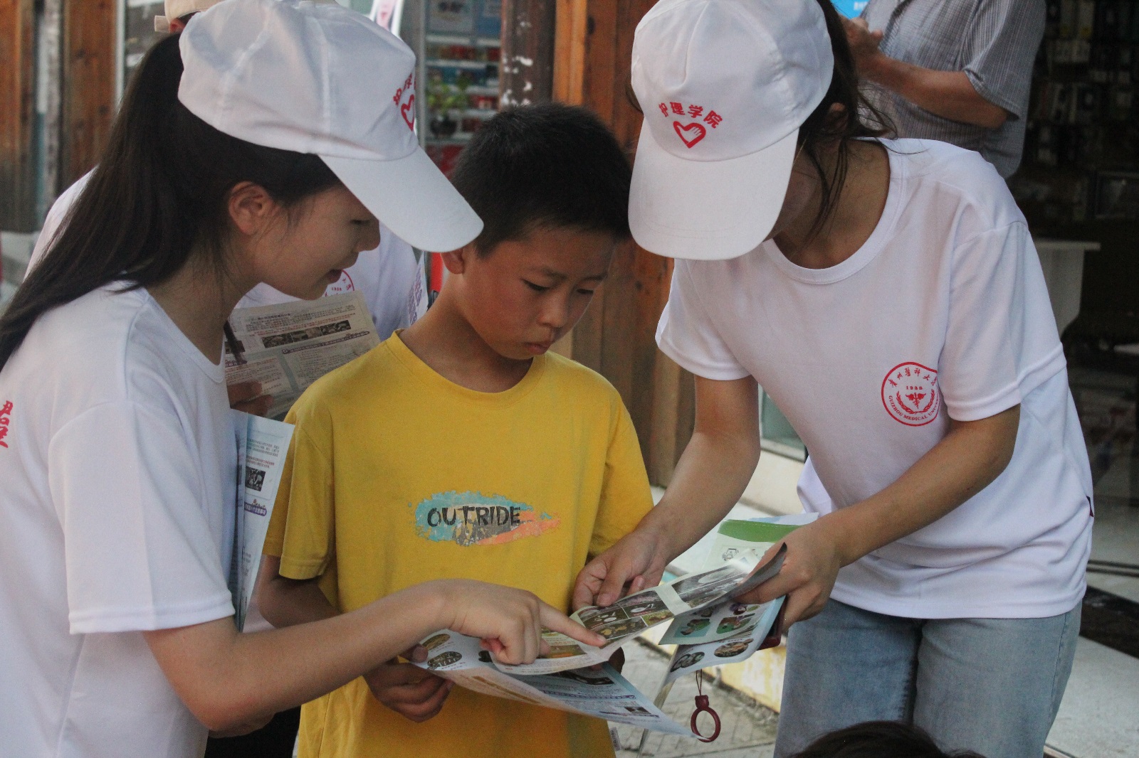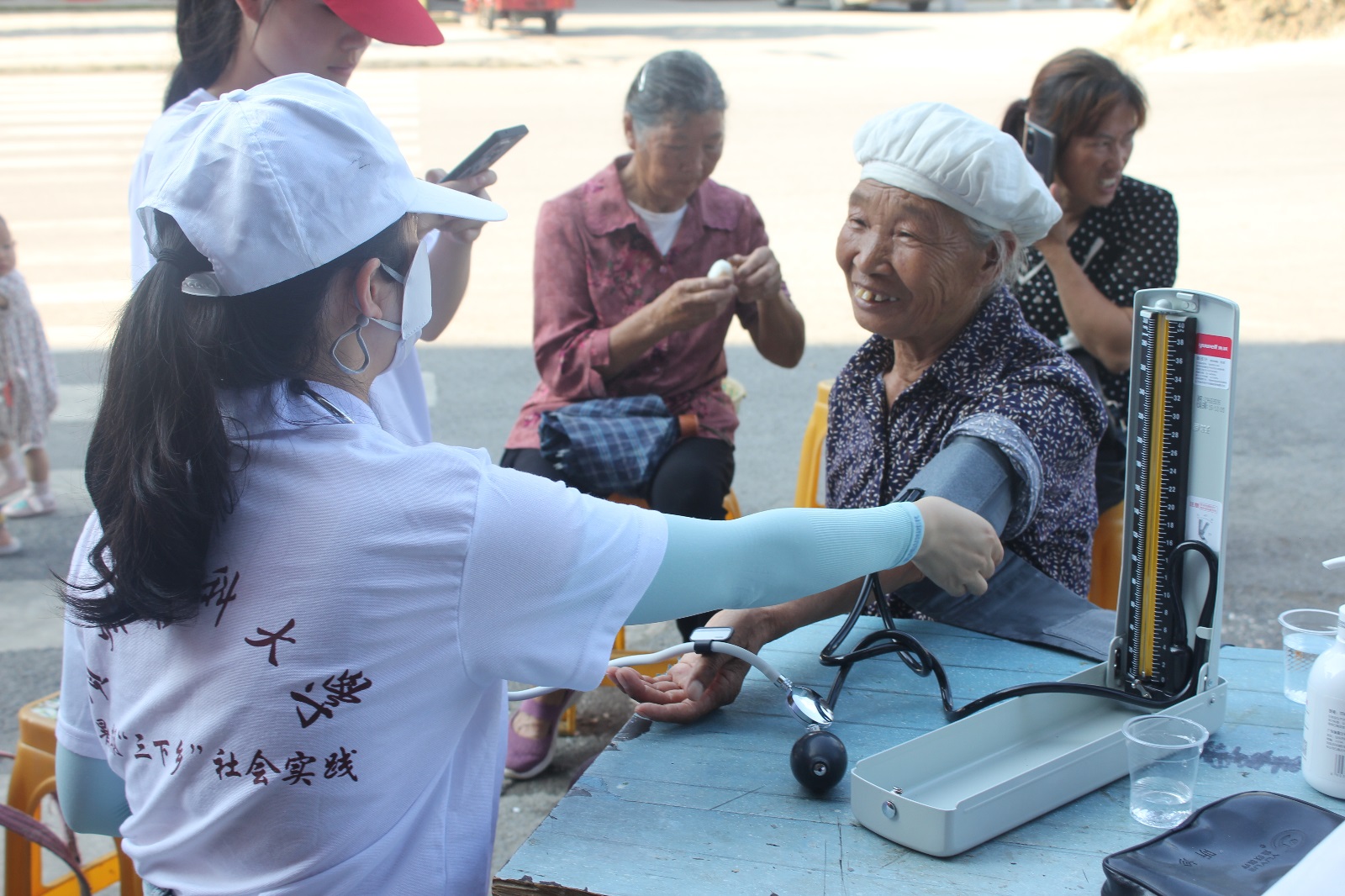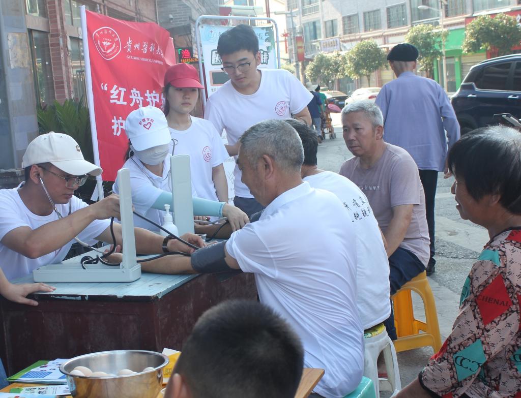 健康问诊:实践服务队成员们将专业知识与技能实操有效衔接,以免费测量血压为主项目,延伸开展了老年人健康现状调研、急救知识普及、禁毒防艾政策宣讲等活动。