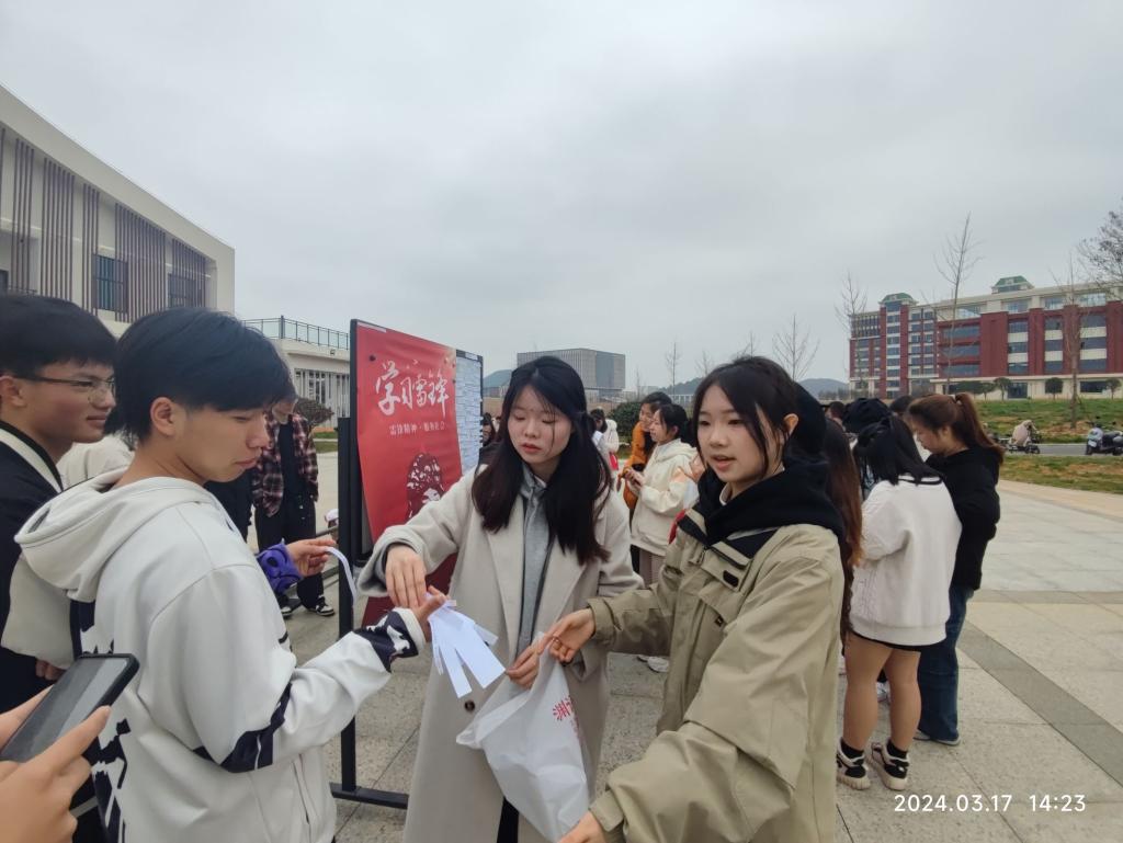 活动前,工作人员认真准备了“学雷锋”相关知识题目。活动中,参与同学通过抽取题目进行答题,回答正确可领取小礼品一份。此次活动还设置了时空对话环节,由工作人员准备好展示墙,展示出雷锋生前的照片、遗物和名言摘录等,参与者可用便利贴留下想对雷锋说的一句话,表达自己对雷锋同志的敬仰和向雷锋同志学习的决心。活动最后,参与的同学募捐了自己的书籍和文具用品,物品将捐赠给省内留守儿童。