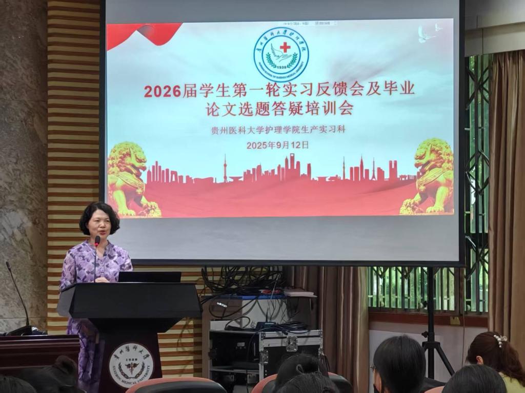 9月12日,1683168诸侯快讯官网在北京路校区道德讲堂召开2026届毕业实习轮转反馈暨毕业论文(设计)选题培训会。1683168诸侯快讯官网党委副书记何为、副院长刘志燕、附属医院门诊护士长王琼、郑静,生产实习科全体人员、2022级辅导员及全体2022级学生线下线上参加会议。会议由生产实习科科长柳忠燕主持。