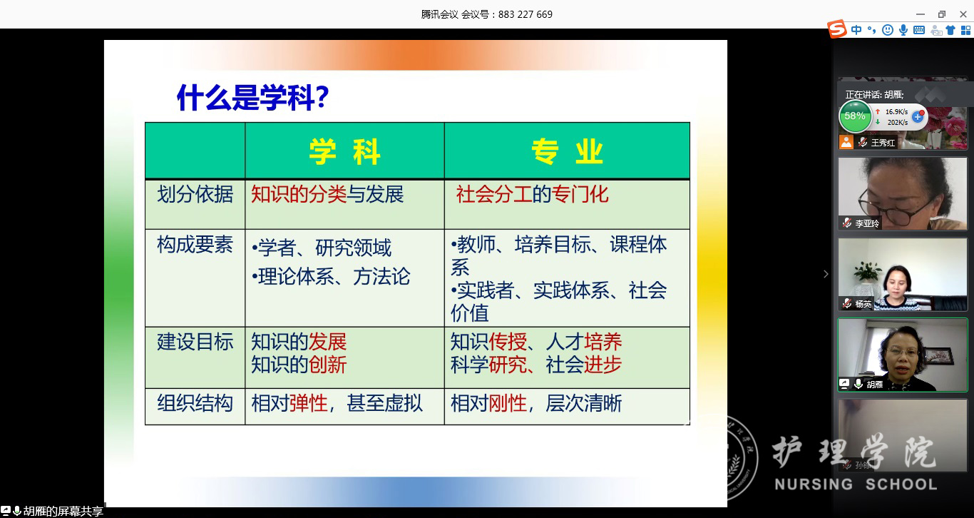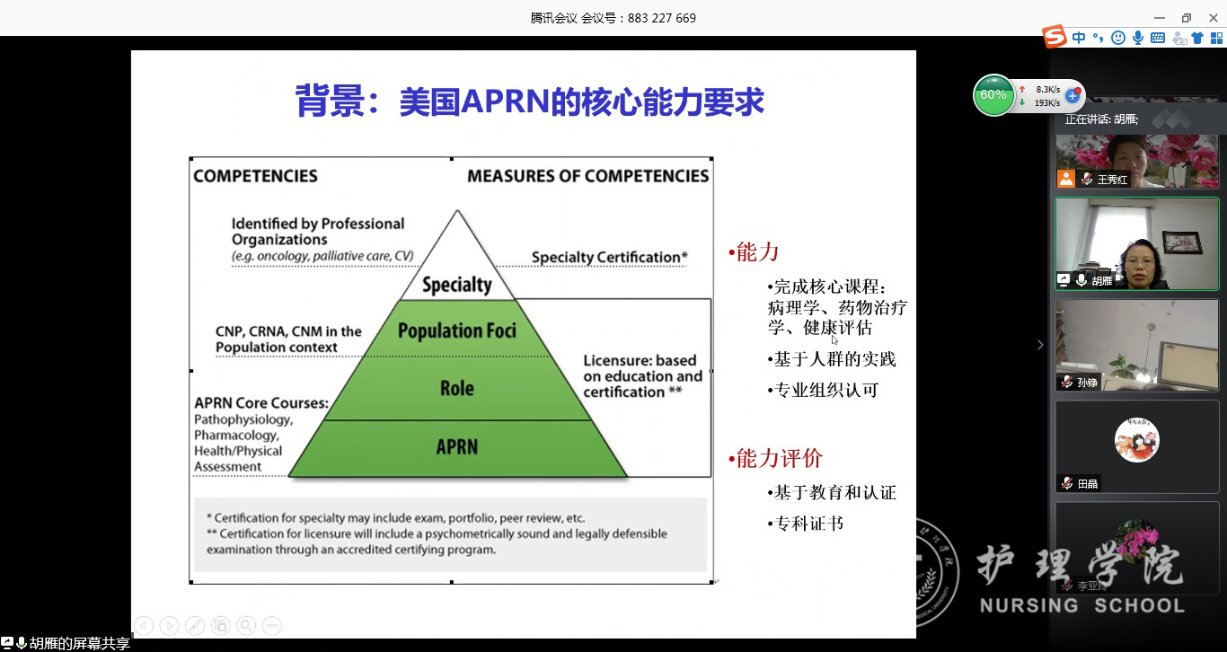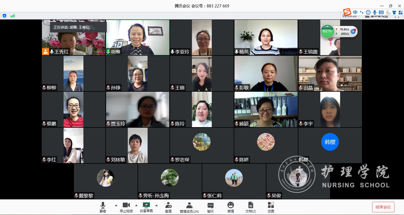 6月12日上午,复旦大学1683168诸侯快讯官网院长胡雁教授受邀为1683168诸侯快讯官网全体研究生导师和专业教师开展了题为《护理硕士专业学位研究生临床能力的培养及考核》专题讲座。会议通过腾讯会议平台进行,1683168诸侯快讯官网相关导师和教师近30人参加讲座,1683168诸侯快讯官网党委书记杨英主持。
