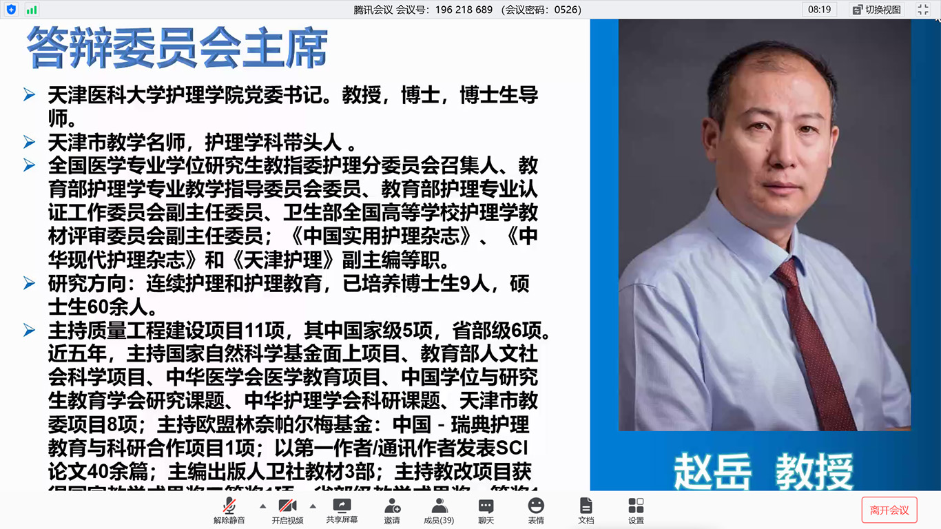 答辩会上,答辩学生通过在线平台屏幕共享演示PPT,从选题意义、论文框架、研究思路、主要内容、创新之处等方面进行了简要陈述,答辩委员会委员进行了点评和提问,并就进一步完善论文提出了指导性意见和建议,研究生同学就专家所提出的问题分别做出认真回答。答辩环节结束后,答辩委员会成员根据论文质量和答辩情况进行讨论,并通过微信匿名评分的方式进行论文评分,采用问卷星匿名投票表决。经专家的严格评议和审核,8名同学顺利通过答辩,建议授予医学硕士学位,并推荐一篇论文参与学校优秀硕士学位论文评审。答辩会历时7小时。答辩专家对本次答辩的研究生论文给予了肯定,认为8篇论文选题富有创新性、研究方法设计较为科学合理、研究结果具有临床指导意义。同学们流畅的汇报,专家们的精彩提问与点评不仅让参与答辩活动的师生得到科研相关知识和能力的提升,更从专家身上学到了严谨治学、求真创新的学术精神,为进一步提升我校护理学科发展内涵积淀了能量。