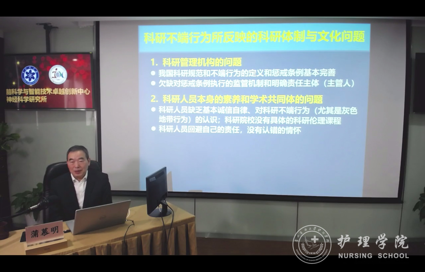 蒲慕明院士从科研伦理、科研行为、科研记录、科研不端和剽窃及论文的署名等涉及的科研诚信问题进行了详细地阐述。首先,他讲述了裁定科研不端行为的三个原则,其背后所反映的是科研体制和文化的问题。他强调不应为了个人荣耀、职位升迁和利益等目的而进行欺骗和科研剽窃。其次,他倡导青年学生树立科学诚信意识,发扬求真务实的学风,引导广大科技工作者追求真理,崇尚创新,鼓励探索。最后,他希望广大研究生同学和科研工作者要保持思考独立性,对学术交流要持一种辩证思维,与他人意见不同时,鼓励同学们踊跃发表自己不同的声音,进行思想的交流碰撞。