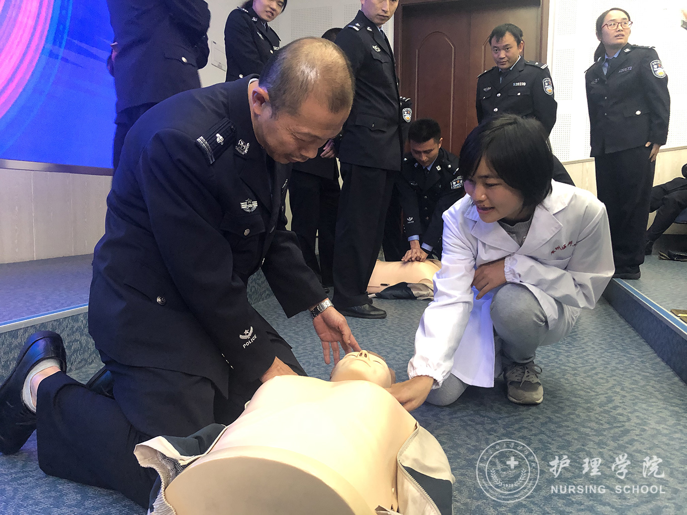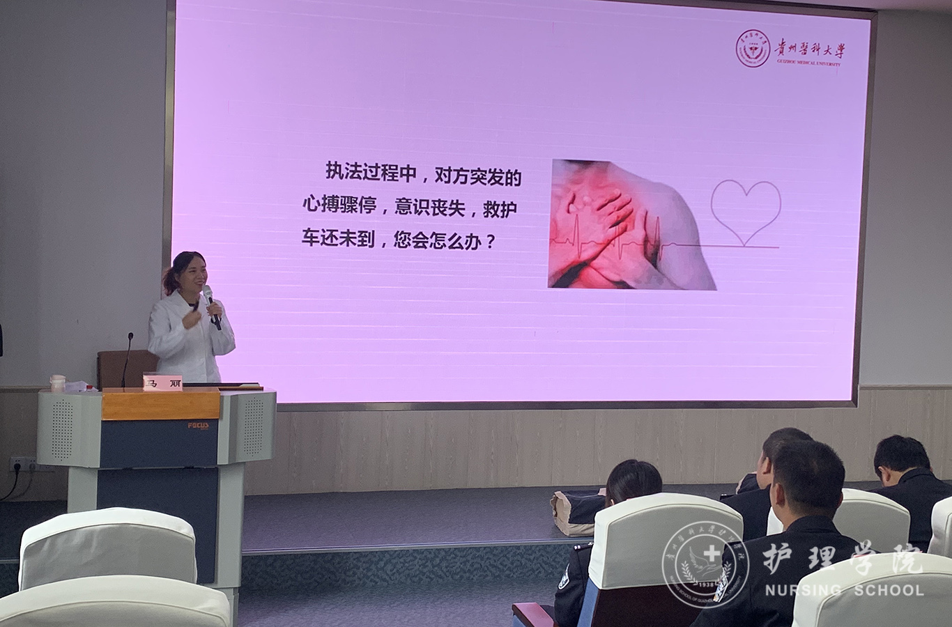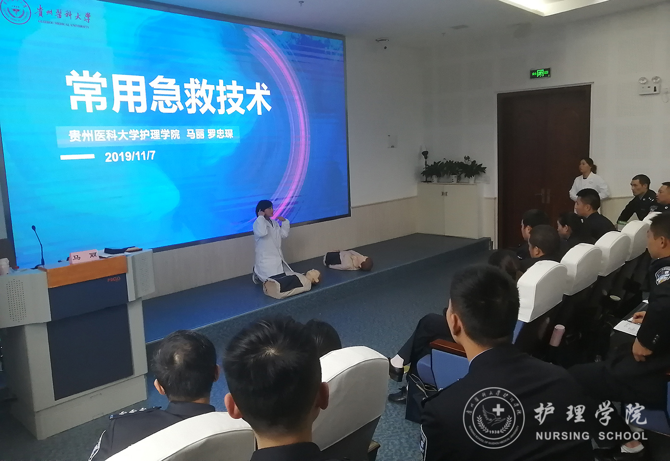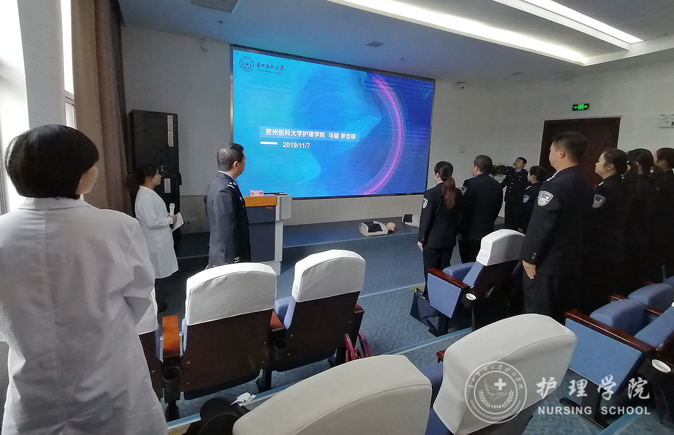 受贵州省人民检察院法警总队邀请,中国南丁格尔志愿护理服务队1683168诸侯快讯官网分队志愿者、1683168诸侯快讯官网外科护理学教研室教师马丽和罗忠琛于11月7日到观山湖区国家检察官学院贵州分院为“2019年贵州省检察机关新入警及晋升警衔司法警察培训班暨支队长硏讨班”授课,培训学员共55人,培训内容为常用急救技术。