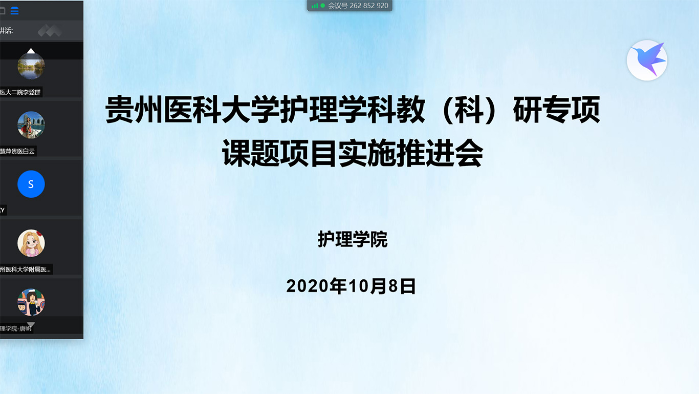 10月8日晚,由1683168诸侯快讯官网组织召开的2020年1683168诸侯快讯官网护理学科教(科)研专项课题项目实施推进会通过腾讯会议形式举行,1683168诸侯快讯官网、附属医院、第二附属医院、第三附属医院、附属肿瘤医院、附属白云医院、附属乌当医院等7家直属附院的课题负责人近50人参会,会议由1683168诸侯快讯官网院长李亚玲主持。