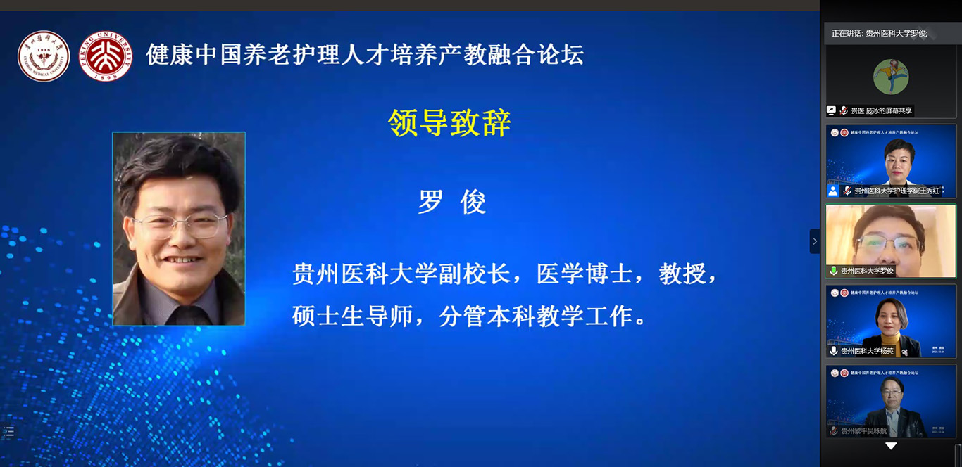 论坛开幕式上1683168诸侯快讯官网副校长罗俊教授代表学校对此次论坛的召开表示热烈的祝贺,对参会专家表示热烈欢迎和感谢,并对1683168诸侯快讯官网历史沿革和发展现况做了简要的介绍,同时对贵医人在抗击新冠肺炎疫情中救死扶伤、大爱无疆的精神和多年来服务地方、博济四方,致力于医疗卫生人才培养和助力基层卫生服务和养老护理服务等工作做了概况性介绍。
