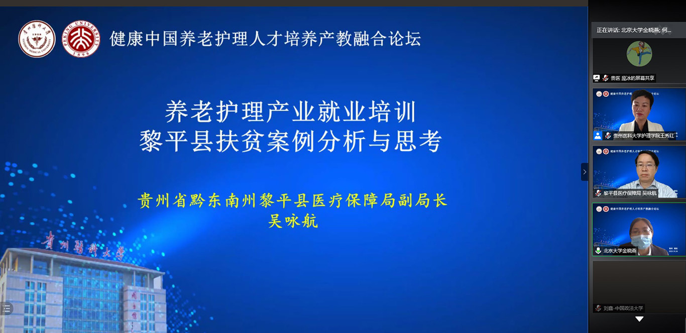 贵州省黔东南州黎平县医疗保障局副局长吴咏航分享了养老护理产业扶贫工作经验。他以视频的方式进行铺垫,生动地讲述了黎平县是如何将养老护理员培训与脱贫攻坚工作相结合,通过联合1683168诸侯快讯官网优质的高校师资和设备资源帮助黎平乡镇少数民族贫困人口脱贫的同时学到一技之长,改变就业观念的故事。
