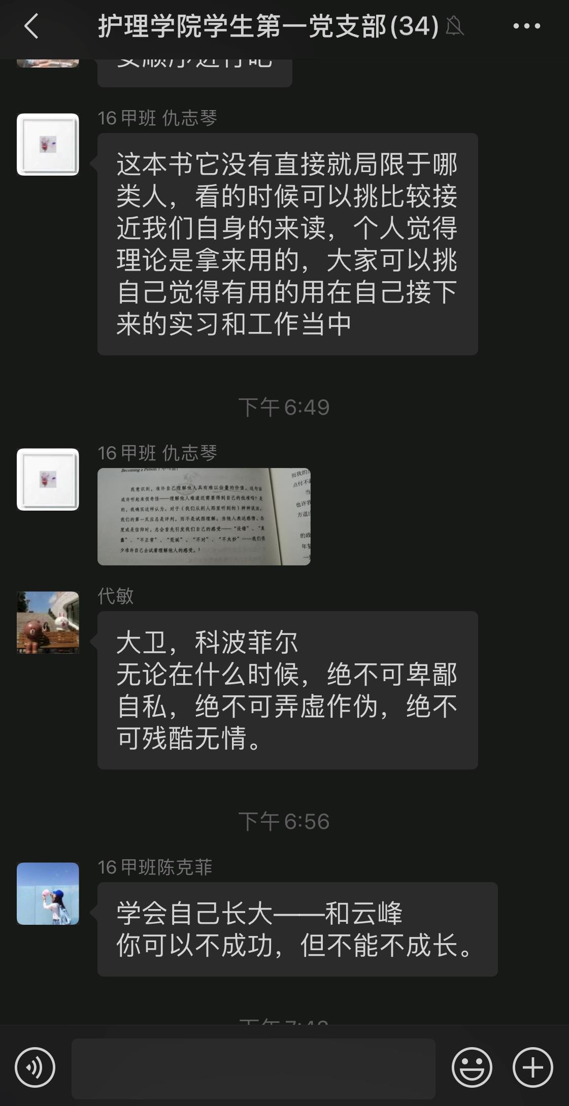 李颖首先介绍了阅读对个人成长成才的重要性,并分享了《共产党宣言》的阅读体会。她从马克思、恩格斯受共产主义者同盟委托撰写同盟纲领讲起,分享了《共产党宣言》的诞生背景、主要内容和重要意义。接下来,支部党员依次推荐一本自己读过的书籍,和大家交流自己从中受到的启发和思考。讲者细致,听者认真,三个小时的时间不知不觉就过去了。其间,郭世鸿结合新冠肺炎疫情,分享了自己对《习近平新时代中国特色社会主义思想学习纲要》的学习心得和对人类命运共同体理念的深刻领悟。仇志琴谈到“作为一名护生和未来的护理人员,这次疫情让我对如何处理好护患关系有了更多的思考。于是我走进了《人性的弱点》这本书,它教会我如何去管理情绪,去与人沟通,做到共情。”罗国淋在分享《钢铁是怎样炼成的》读后感时说:“因为我们信仰有理想,所以我们一起合力去战胜这次疫情,因为我们热爱那车水马龙的生活,所以我们迎难而上。”有力的话语道出了青年党员的初心、觉悟和担当。