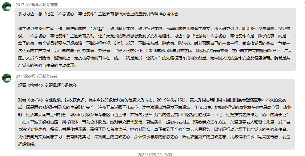 学生第二党支部全体党员通过QQ群、学习强国视频会议等形式开展线上“三会一课”,加强理论学习。全体党员先后观看学习了榜样4视频,学习了习近平总书记在“不忘初心、牢记使命”主题教育总结大会上的讲话精神、习近平总书记在中央政治局常委会会议研究应对新型冠状病毒肺炎疫情工作时的讲话精神等。同时,学生第二党支部组织党员结合所学内容和自身实际开展讨论,撰写心得体会,提高支部党员的思想政治觉悟和政治理论水平。