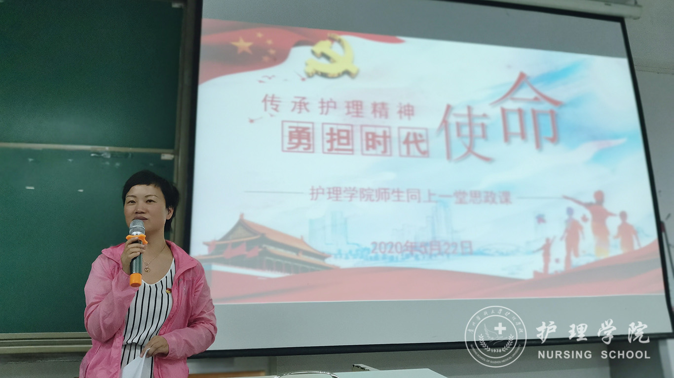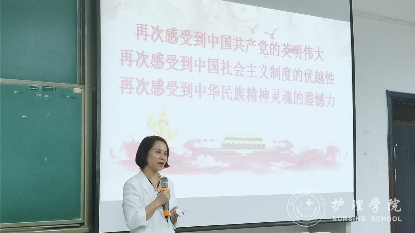 杨英从共产党员、医护人员的初心讲起,从新冠肺炎疫情产生的过程,讲到贵州援鄂医疗队支援鄂州、支援武汉,同心抗击疫情,践行初心使命的感人故事。杨英指出,在抗疫疫情的过程中,医护人员用生命践行了使命,用大爱书写了担当。在派出的医务人员中,近7成都是我们护士。她们与鄂州护士携手共同抗疫,不负重托,用爱点亮了生命之光。杨英强调,抗击新冠疫情的过程,让我们再次感受到中国共产党的英明伟大,再次感受到中国特色社会主义制度的优越性,再次感受到中华民族精神灵魂的震憾力。最后,她勉励全体青年党员,要勇于承担社会和人民赋予的责任,要从义无反顾、逆行而上的师长身上学会医者的使命和担当,要以抗疫精神鼓舞士气,不畏艰险,不怕困难,勇挑重担,勇往直前!