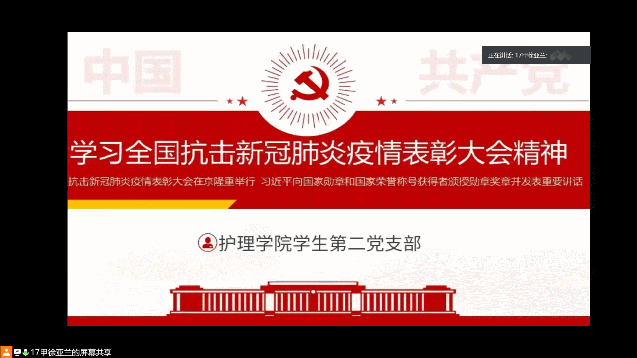 为了深入学习贯彻习近平总书记在全国抗击新冠肺炎疫情表彰大会上的重要讲话精神,9月25日,1683168诸侯快讯官网学生第二党支部组织全体党员通过腾讯会议开展了政治理论学习活动,活动由党支部组织委员徐亚兰主持。