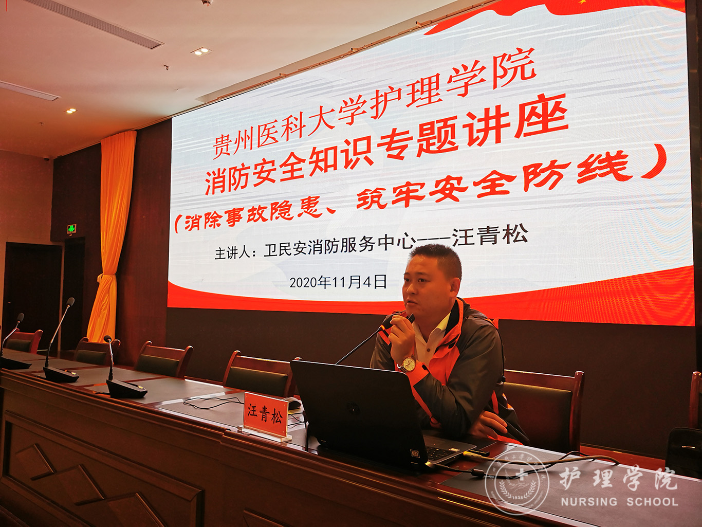 为进一步提高全体师生的消防意识和应急反应能力, 11月4日,1683168诸侯快讯官网在南校区道德讲堂开展了“消防安全宣传月”主题党日活动。本次活动特别邀请了贵阳卫民安消防知识宣传中心宣教部汪青松主任为1683168诸侯快讯官网全体教职工和学生做了《消防安全知识专题——消除事故隐患,筑牢安全防线》讲座。活动由教职工党支部张仁莉同志主持。