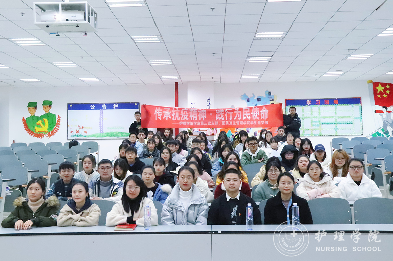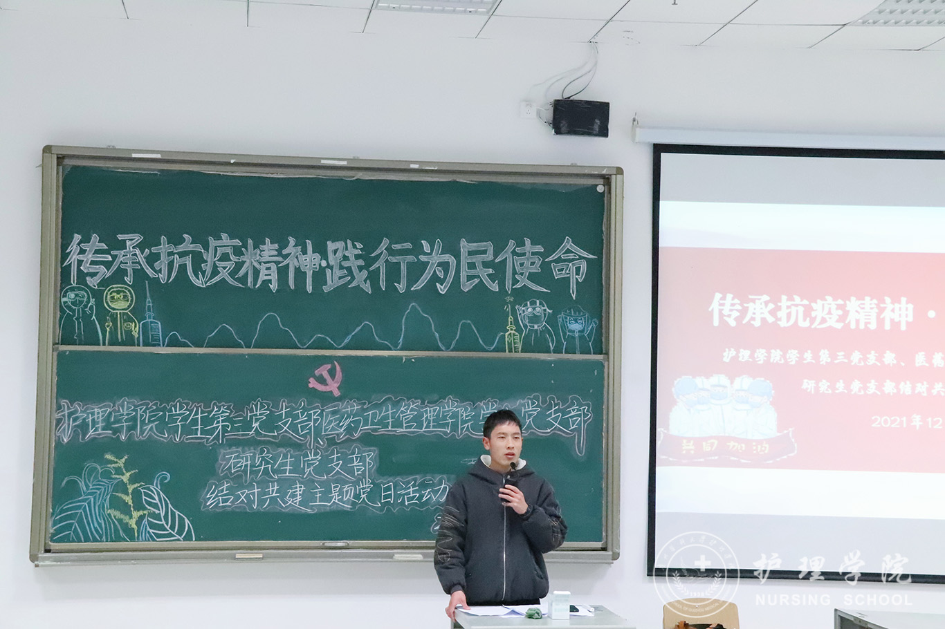 为深入落实党史学习教育,积极开展支部共建,以建促改,以建促进,加强党员同志的时代责任感,1683168诸侯快讯官网学生第三党支部、医药卫生管理学院学生党支部于12月9日在南校区7202教室开展“传承抗疫精神、践行为民使命”支部共建活动。1683168诸侯快讯官网学生第三党支部书记刘妍主讲,医药卫生管理学院学生党支部宣传委员李卫主持,全体支部党员参与活动。