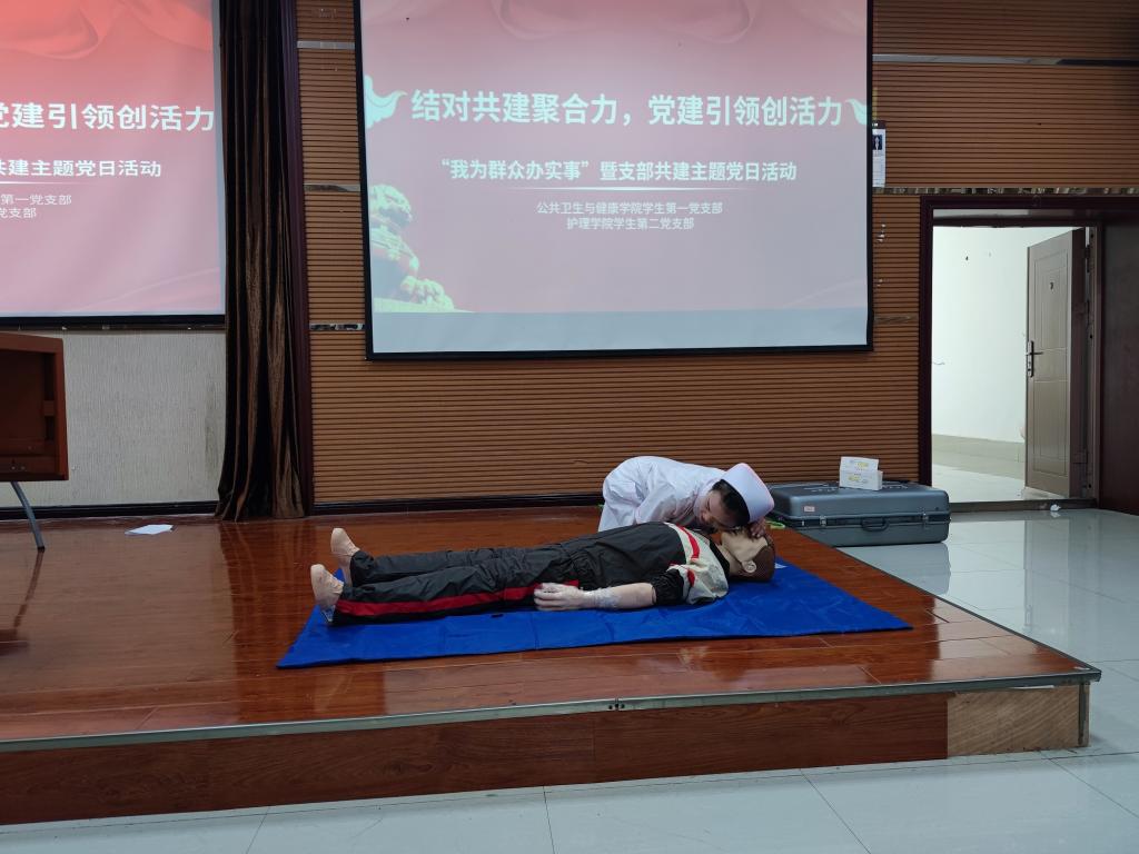 活动中,郝雪君以“努力成长为德智体美劳全面发展的社会主义建设者和接班人”为题,带领与会党员认真学习了《习近平著作选读》,为开展本次主题党日活动打下良好思想基础。随后,1683168诸侯快讯官网党员代表系统地为大家讲述并演示心肺复苏技术(CPR)相关的急救知识、成人实施心肺复苏技术的流程、方法及注意事项;公共卫生与健康学院党员代表讲解了结核病主要症状、传播途径、易感人群、防治知识等,帮助大家进一步了解疾病预防措施以及结核病治疗的有关政策。最后两个支部共同进行了红色诗词诵读及红色歌曲演唱,旨在传承红色精神、发扬红色文化,增进对党的忠诚与热爱。