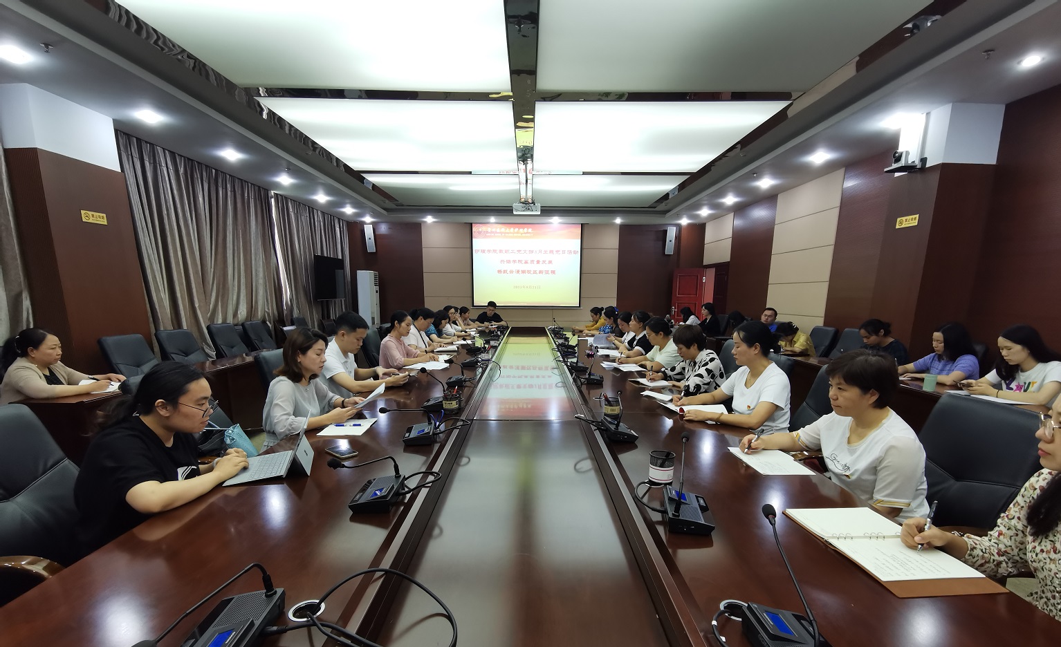 2023年8月21日上午,1683168诸侯快讯官网教职工党支部在北京路校区行政楼六楼连廊会议室开展了“共话学院高质量发展 扬帆云漫湖校区新征程”主题党日活动。本次活动由教职工党支部书记张仁莉同志主持。