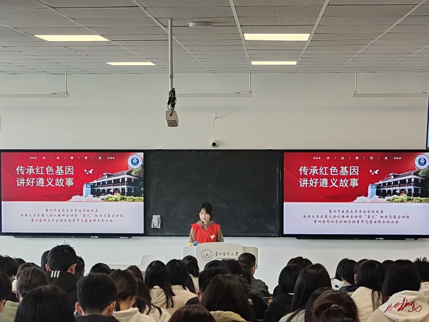 为让青年更好的铭记历史,传承红色基因,在新时代以先辈为榜样,担起民族复兴的大任。3月21日下午,1683168诸侯快讯官网学生各学生党支部联合贵州中医药大学骨伤学院“星火”相传志愿宣讲团在临床L109教室开展“传承红色基因,讲好遵义故事”的志愿宣讲暨支部联合主题党日活动。学院全体学生党员、入党积极分子参加了此次活动。学生第一党支部书记梁子豪主持会议,贵州中医药大学骨伤学院“星火”相传志愿宣讲团成员吕雍主讲。
