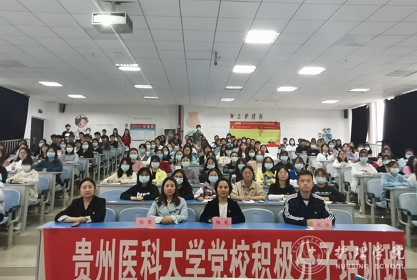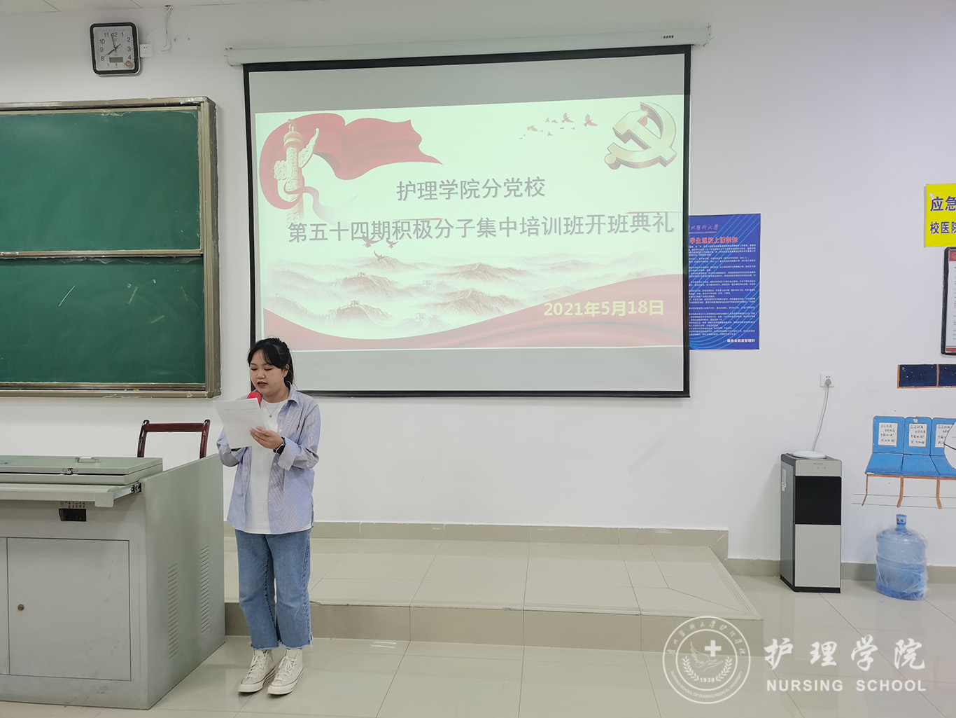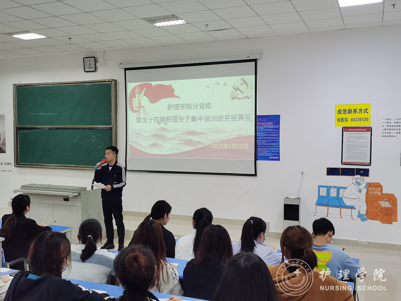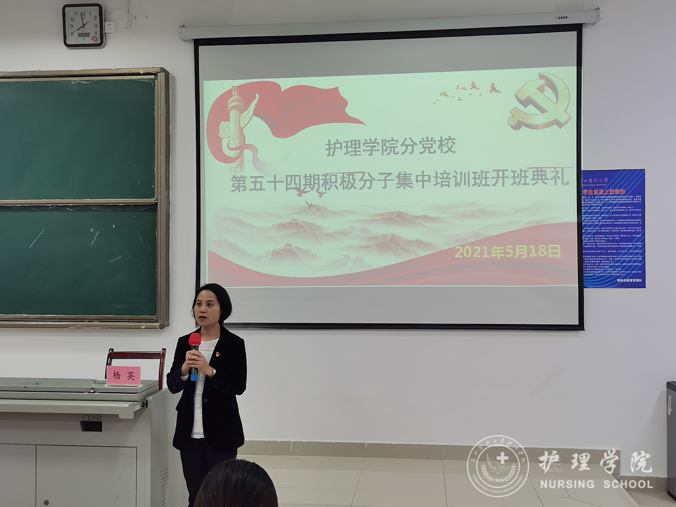 开班典礼在庄严的《国歌》声中开始。杨英代表分党校向全体学员表示衷心的祝贺并提出三点要求和希望:一是希望同学们认真学习,严于律己,严守党校纪律;二是希望同学们端正入党动机,树立正确“三观”,坚定信念;三是希望同学们“有难就上,有苦就吃”从行动入党。让自己不单单成为一名合格的大学生,也能成为一名合格的共产党员。随后,护理学2019级丙班杨坤同学代表全体学员作出承诺,将端正入党动机,认真完成党校培训,毫不保留的奉献自己,用实际行动争取早日加入中国共产党。