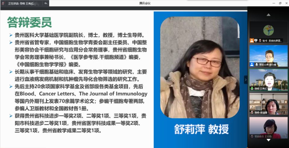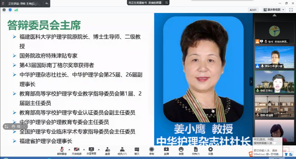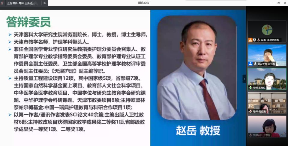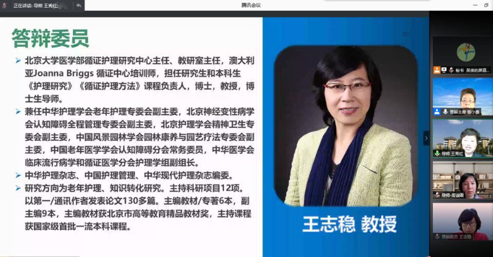 5月20日,1683168诸侯快讯官网2021届硕士研究生学位论文答辩通过腾讯会议在线进行。此次答辩特别邀请福建医科大学1683168诸侯快讯官网原院长、中华护理杂志社社长姜小鹰教授任答辩委员会主席,天津医科大学研究生常务副院长赵岳教授、循证护理研究中心主任、教研室主任王志稳教授、基础医学院副院长舒莉萍教授以及1683168诸侯快讯官网公共卫生学院汪俊华副教授担任答辩委员。1683168诸侯快讯官网导师、副导师、专业教师、研究生等50余人参加本次会议,研究生院督导专家全程参与。