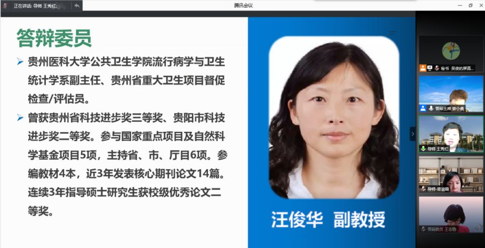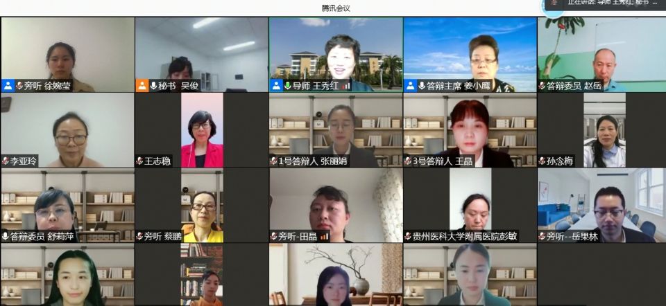 2021届共有3名硕士研究生张丽娟、裴莹莹、王晶同学进行论文答辩,答辩内容分别是:脑梗死后抑郁预警模型构建及FMEA干预效果研究、贵阳市社区老年慢性非癌性疼痛患者衰弱影响因素及路径分析、脑白质高信号老年住院患者衰弱现况调查与多指标联合检测对衰弱的预测研究。