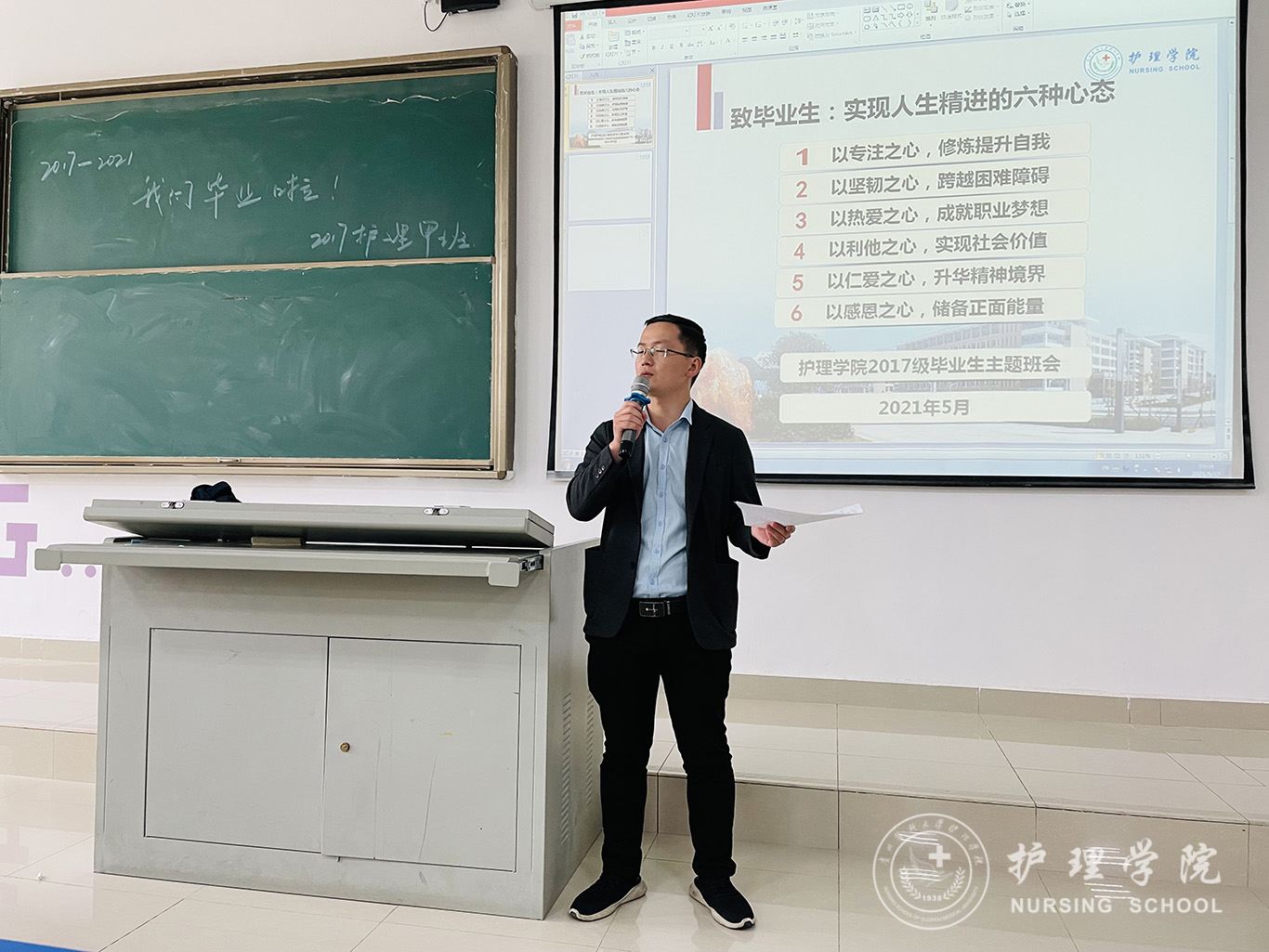 接着,马景瑶为毕业生上了一堂“实现人生精进的六种心态”为题的思政课:以专注之心,修炼提升自我;以坚韧之心,跨越困难障碍;以热爱之心,成就职业梦想;以利他之心,实现社会价值;以仁爱之心,升华精神境界;以感恩之心,储备正面能量。