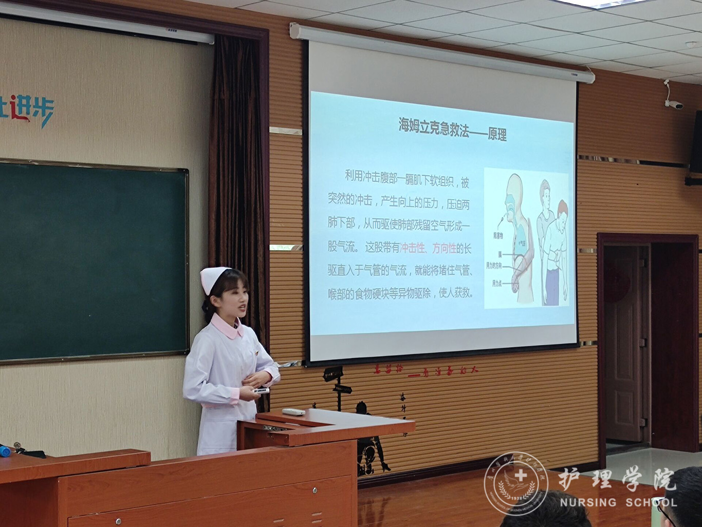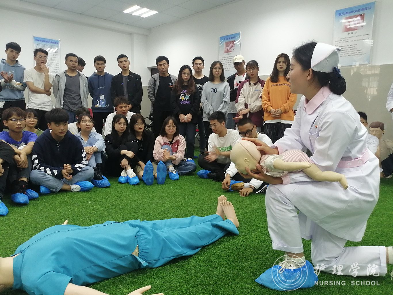 在教室里,两位主讲同志结合临床实际对CPR及海姆立克急救法进行绘声绘色的讲解,呈现给受训学生凝练而又专业的理论知识,在CPR模拟实验室中,主讲同志进行了干脆利落,讲解详实的实操演练,展现了一名护理专业应届毕业生的专业与干练,随后技能协会成员对参训同学进行了详细指导及分组练习。