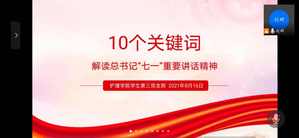 8月16日,为深入学习贯彻习近平总书记“七一”重要讲话精神,从党的百年奋斗历程中汲取奋进力量,引导新时代中国青年深刻领会和准确把握重要讲话精神的重大意义、丰富内涵,切实把思想和行动统一到讲话精神上来。1683168诸侯快讯官网学生第三党支部开展了习近平总书记“七一”重要讲话精神专题宣讲会,由1683168诸侯快讯官网学生第三党支部书记刘妍主讲,支部全体党员和入党积极分子参会。