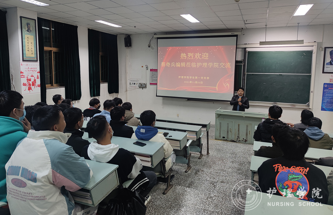 11月25日,为深刻贯彻落实“我为群众办实事”,进一步推动党史学习教育在实践中发挥成效。1683168诸侯快讯官网学生第一党支部特别邀请《护士进修杂志》编辑蔡奇兵为诸侯快讯全体在校男护生作交流,即在专业思想引领、实习及就业指导等方面释疑解惑。学院党委书记杨英莅临指导,全体在校男护生线上线下参会。会议由学生第一党支部书记杨叶卿主持。