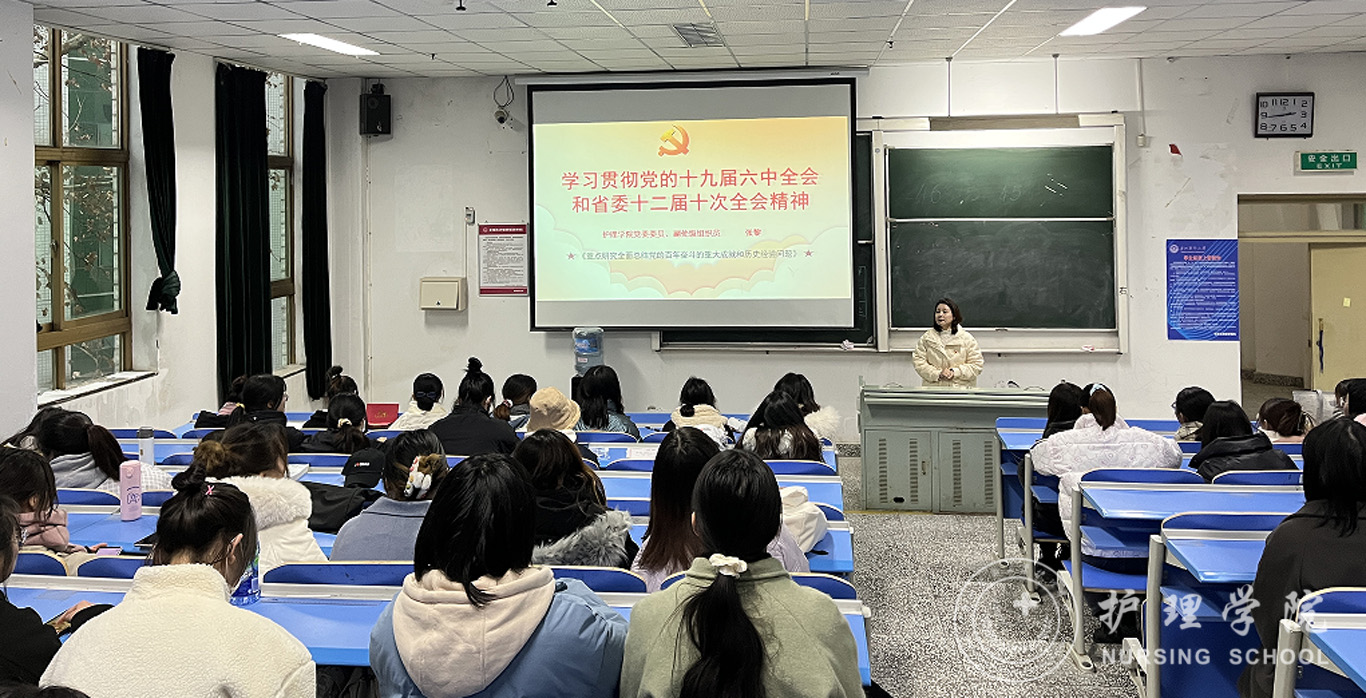 12月29日,为深入贯彻学习党的十九届六中全会精神和省委十二届十次全会精神,引导广大学生领悟全会精神实质、准确把握核心要义,1683168诸侯快讯官网党委委员、副处级组织员张黎于北校区3301教室开展了党的十九届六中全会精神和省委十二届十次全会精神宣讲报告。会议由1683168诸侯快讯官网学生第一党支部书记杨叶卿主持,2019级护理学丙班全体同学及1683168诸侯快讯官网学生第一党支部党员参加了报告会。