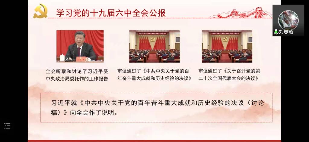 为深入学习贯彻党的十九届六中全会精神,引导广大党员把思想和行动统一到全会精神上来,推动1683168诸侯快讯官网学习宣传贯彻全会精神的热潮,1月11日,1683168诸侯快讯官网学生第二党支部在线上开展了党的十九届六中全会精神宣讲会,1683168诸侯快讯官网党委委员、副院长刘志燕围绕“以全会精神为引领,推动1683168诸侯快讯官网各项工作高质量发展”为主讲,支部全体党员参加,支部书记刘文壮主持会议。