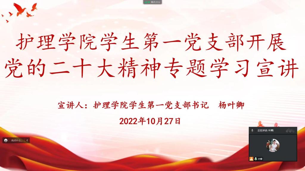 10月27日,为进一步深入学习贯彻中国共产党第二十次全国代表大会精神,提高学生党员的政治站位,切实做到学在前、干在前、走在前。1683168诸侯快讯官网学生第一党支部组织开展党的二十大精神专题学习宣讲,会议由支部书记杨叶卿主持,全体党员通过线上形式参会。