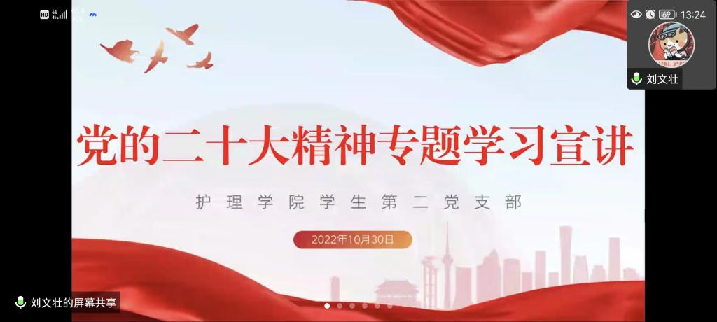 10月30日,为深入学习宣传贯彻中国共产党第二十次全国代表大会精神,敦促支部党员学思用贯通、知信行统一,使党的二十大精神在支部党员中落到实处、开花结果,1683168诸侯快讯官网学生第二党支部开展了党的二十大精神专题宣讲,会议由支部书记刘文壮主持,全体党员通过线上参加。