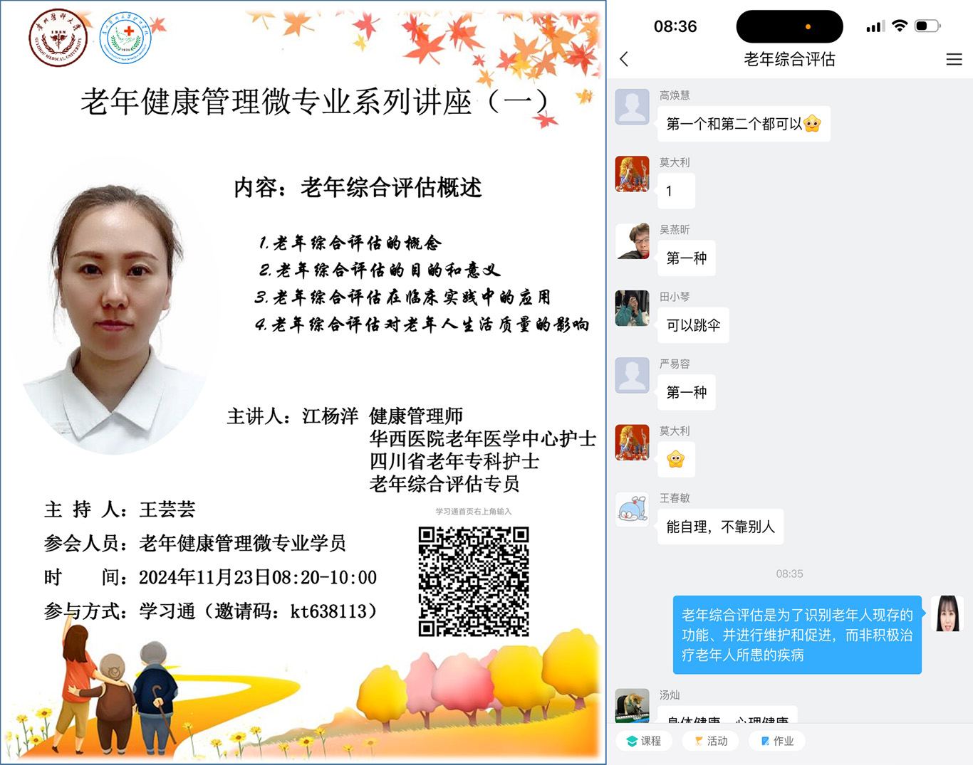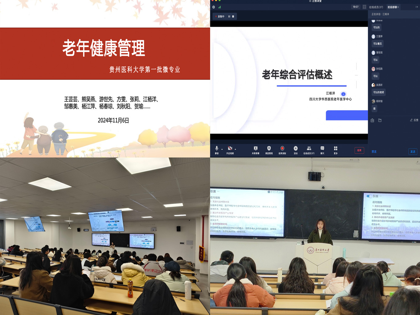 11月6日,老年健康管理微专业正式开课,课程内容涵盖了《老年辅具使用》《养老院的经验与管理》《老年综合评估》等实用科目,授课团队主要由1683168诸侯快讯官网专职教师、南明区晚霞彩带老年人日间照料中心的资深团队成员、附属医院老年医学科医护人员以及四川大学华西医院老年医学中心护士组成。