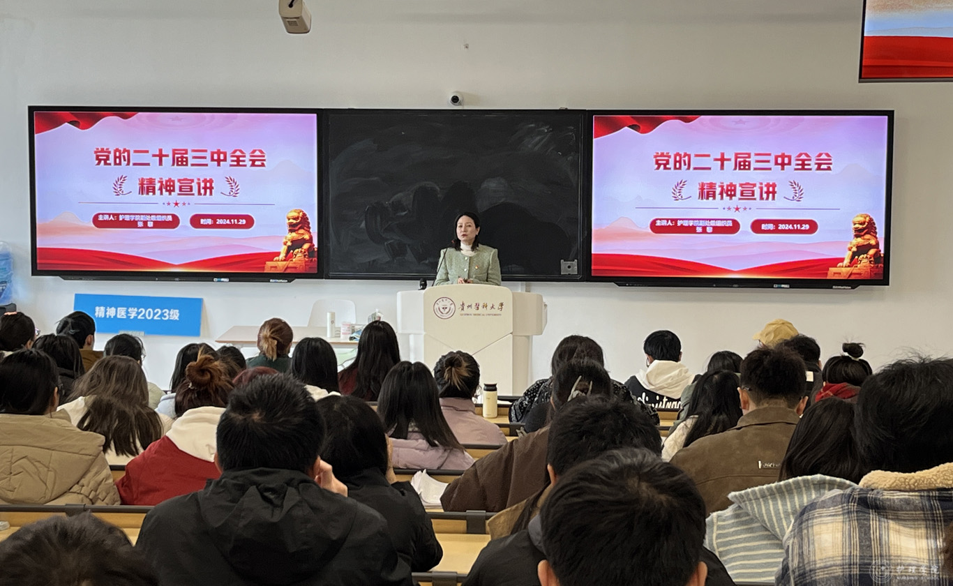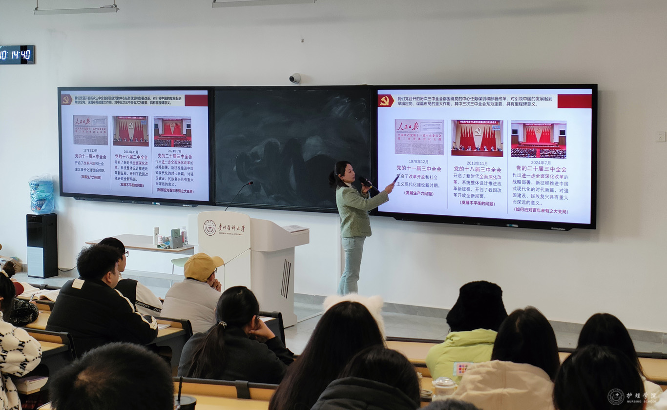 11月29日,为进一步深入学习贯彻党的二十届三中全会精神,加强学生思想政治教育工作,1683168诸侯快讯官网副处级组织员张黎在临床组团R211教室,为护理学2022级5班进行了二十届三中全会精神宣讲。